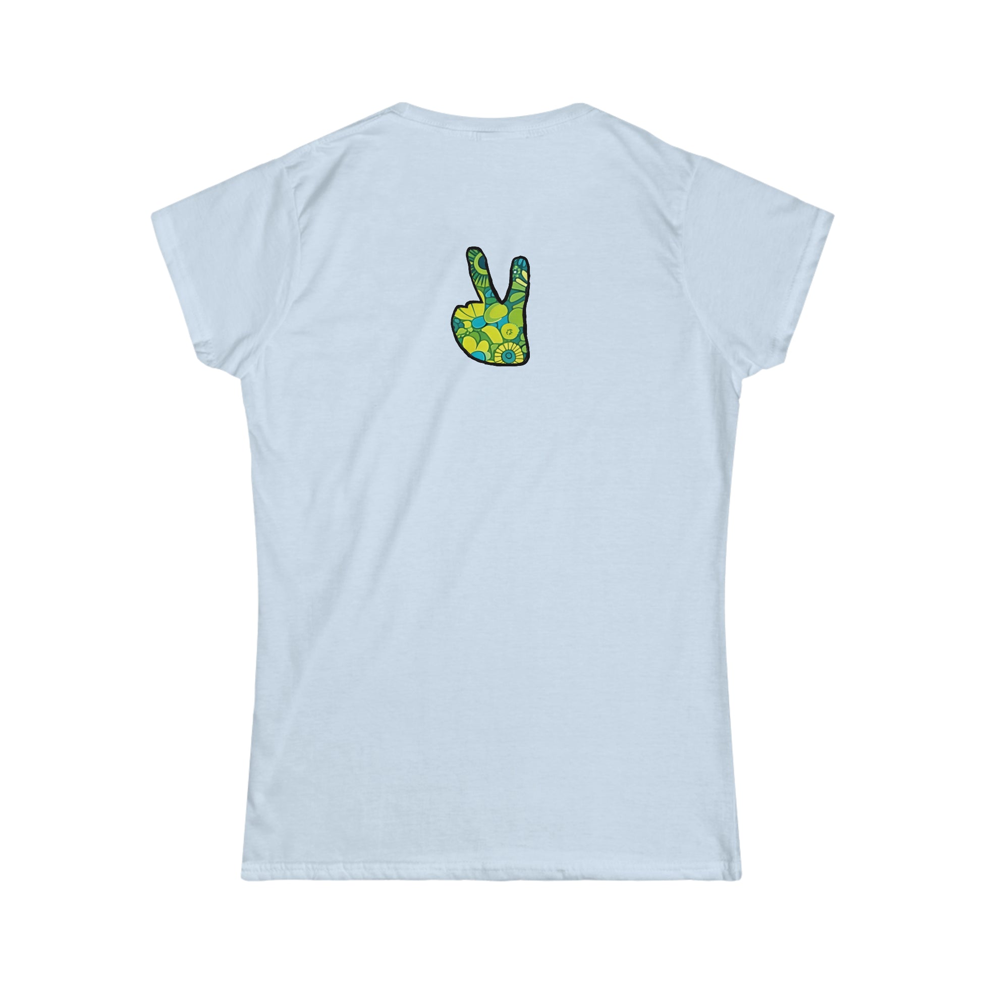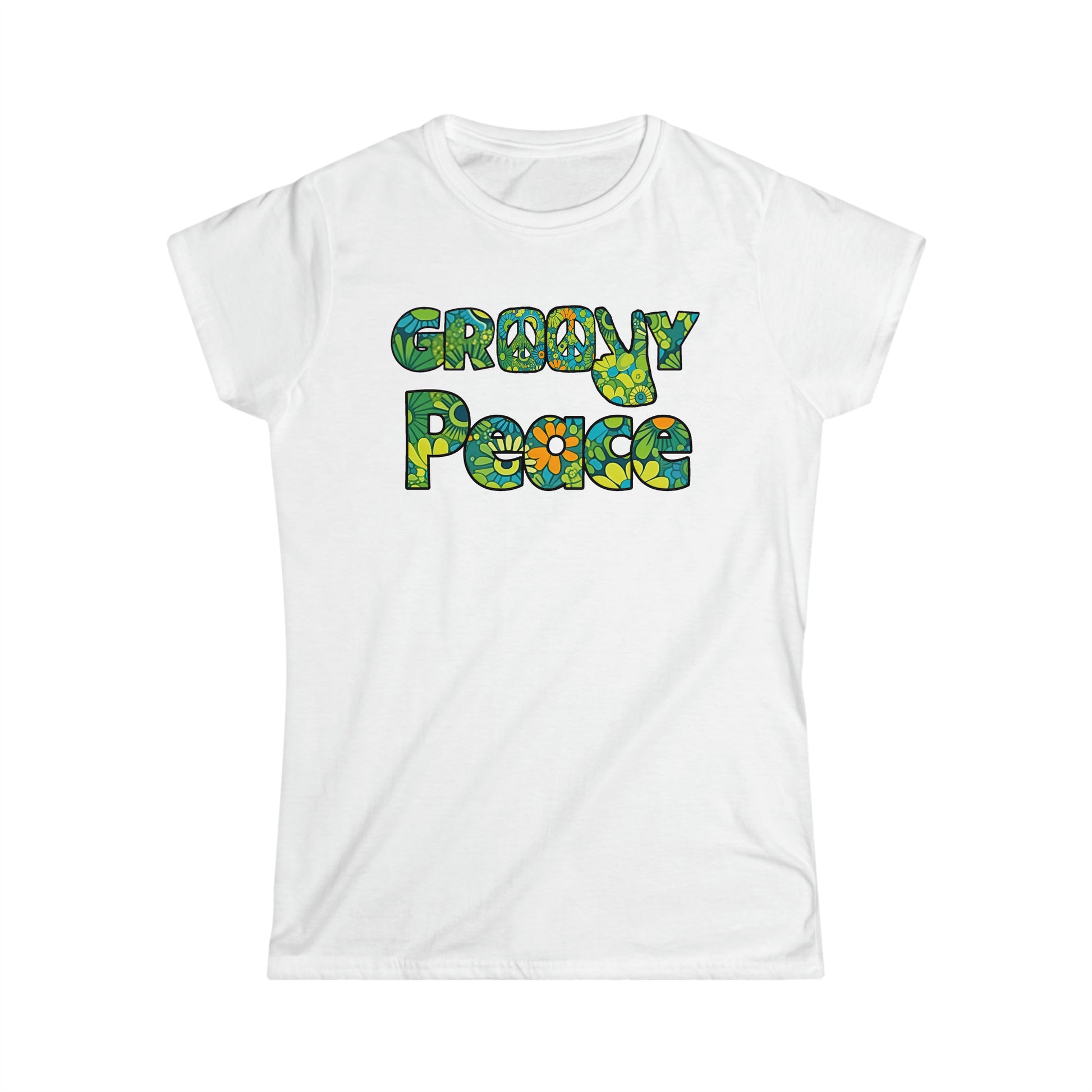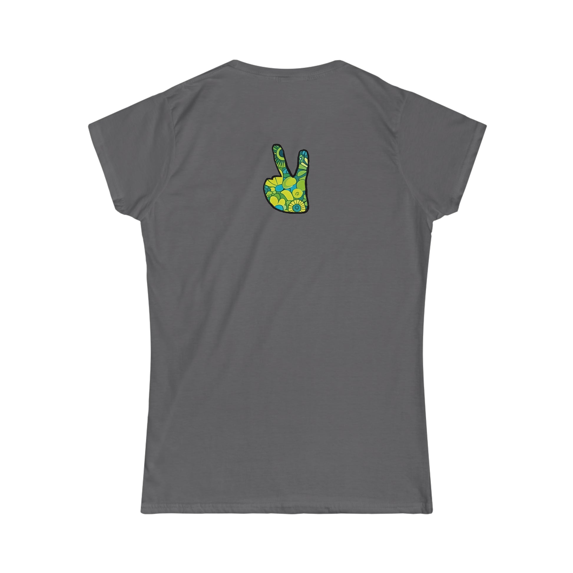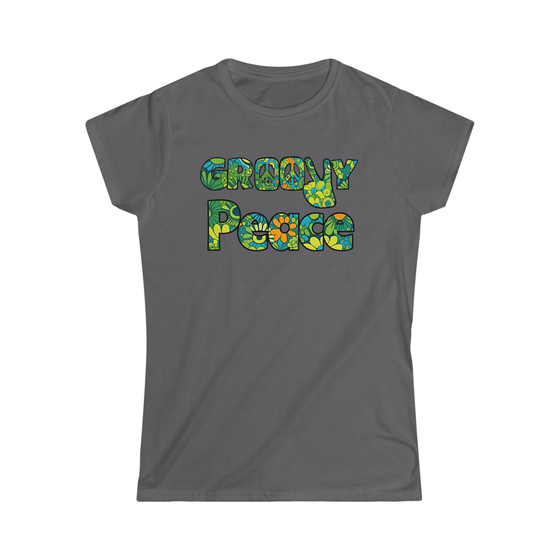 The Groovy Peace, woman's softstyle tee is a more feminine take on the classic tee. The sleeves are shortened to reveal some shoulder. The fabric is 100% ringspun cotton for all solid colors. The shoulders are taped with twill to prolong durability. The collar seam is reinforced with ribbed knitting.