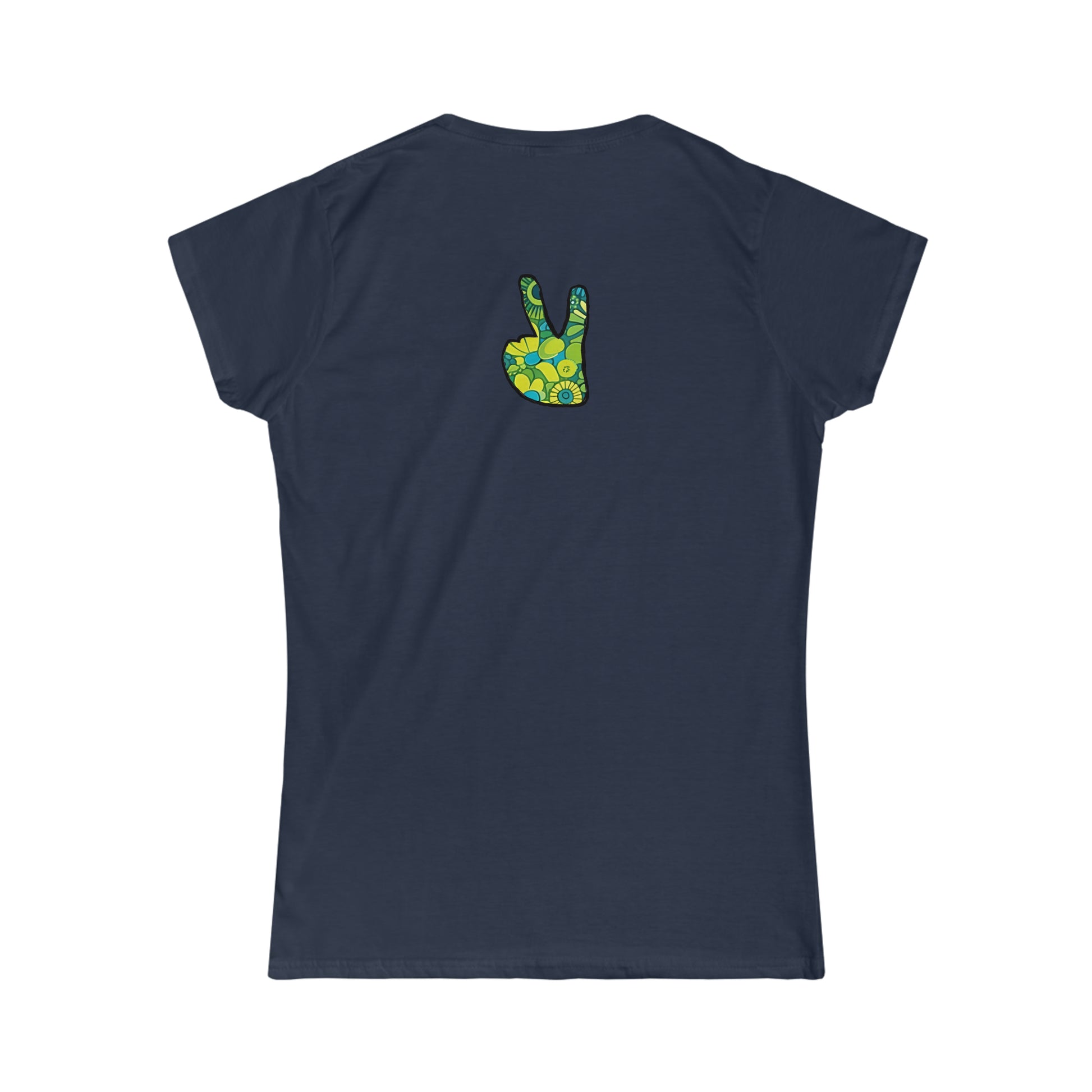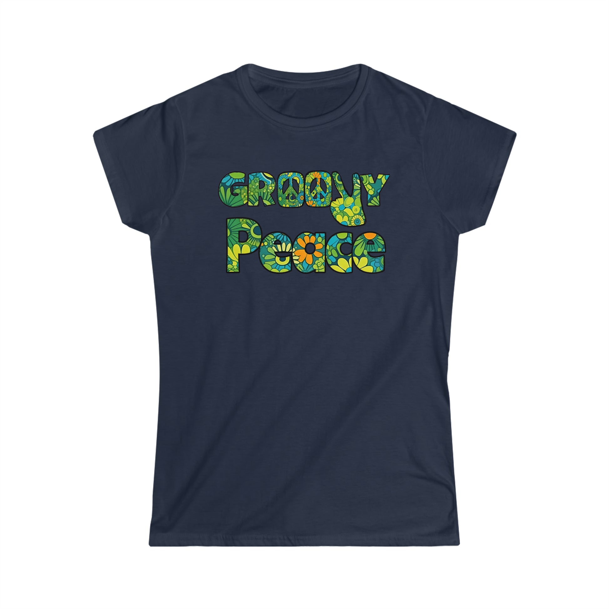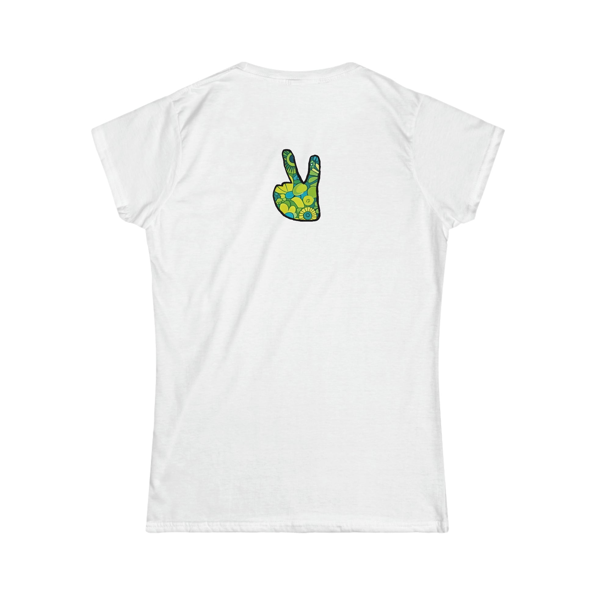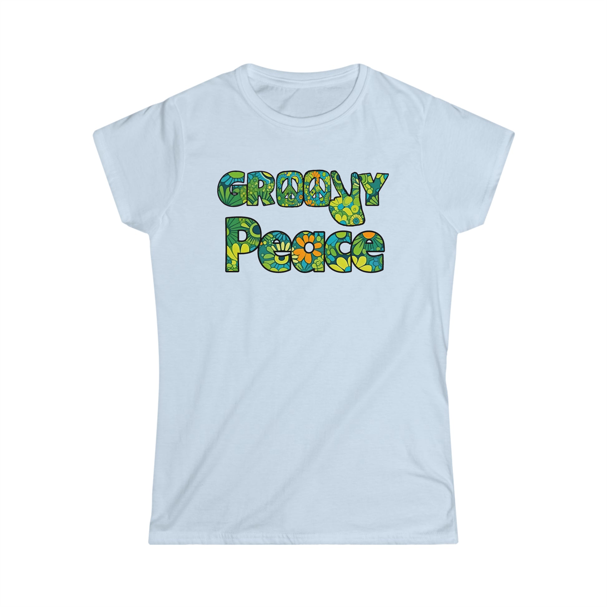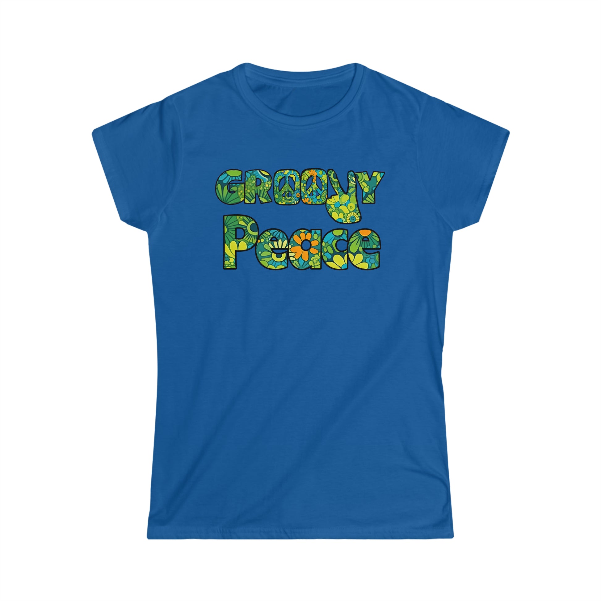 The Groovy Peace, woman's softstyle tee is a more feminine take on the classic tee. The sleeves are shortened to reveal some shoulder. The fabric is 100% ringspun cotton for all solid colors. The shoulders are taped with twill to prolong durability. The collar seam is reinforced with ribbed knitting.