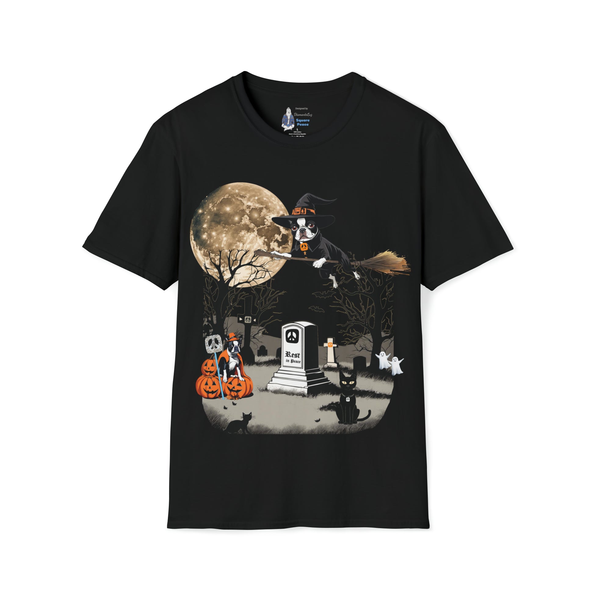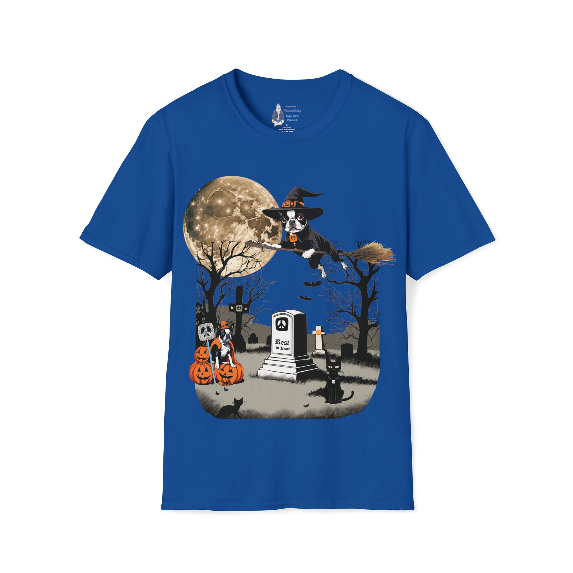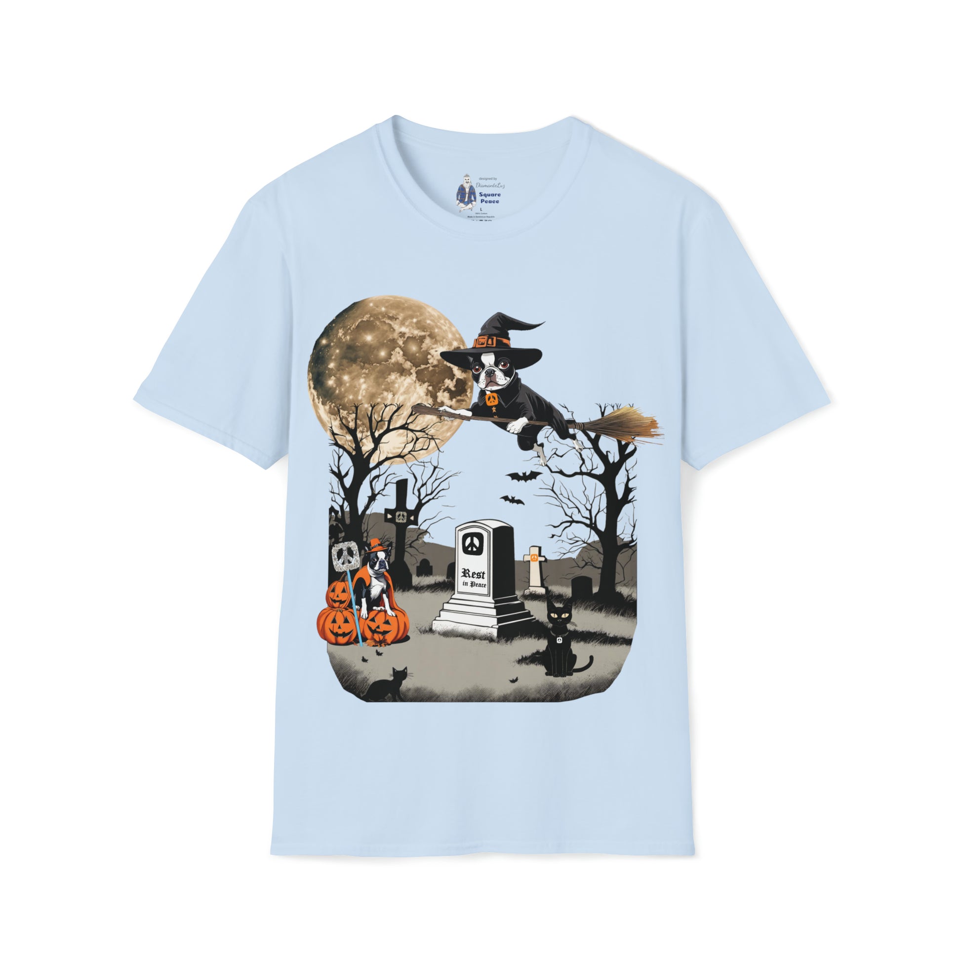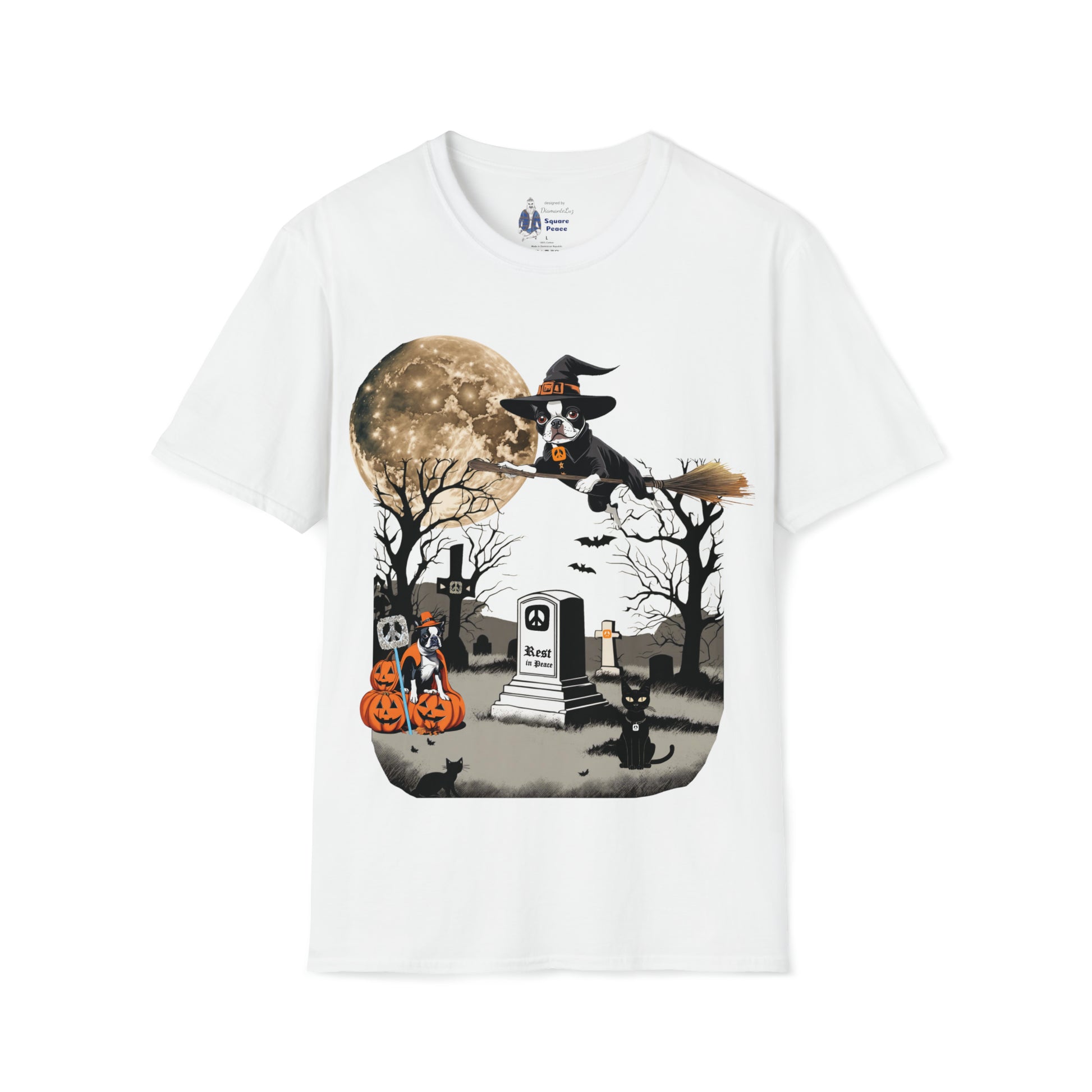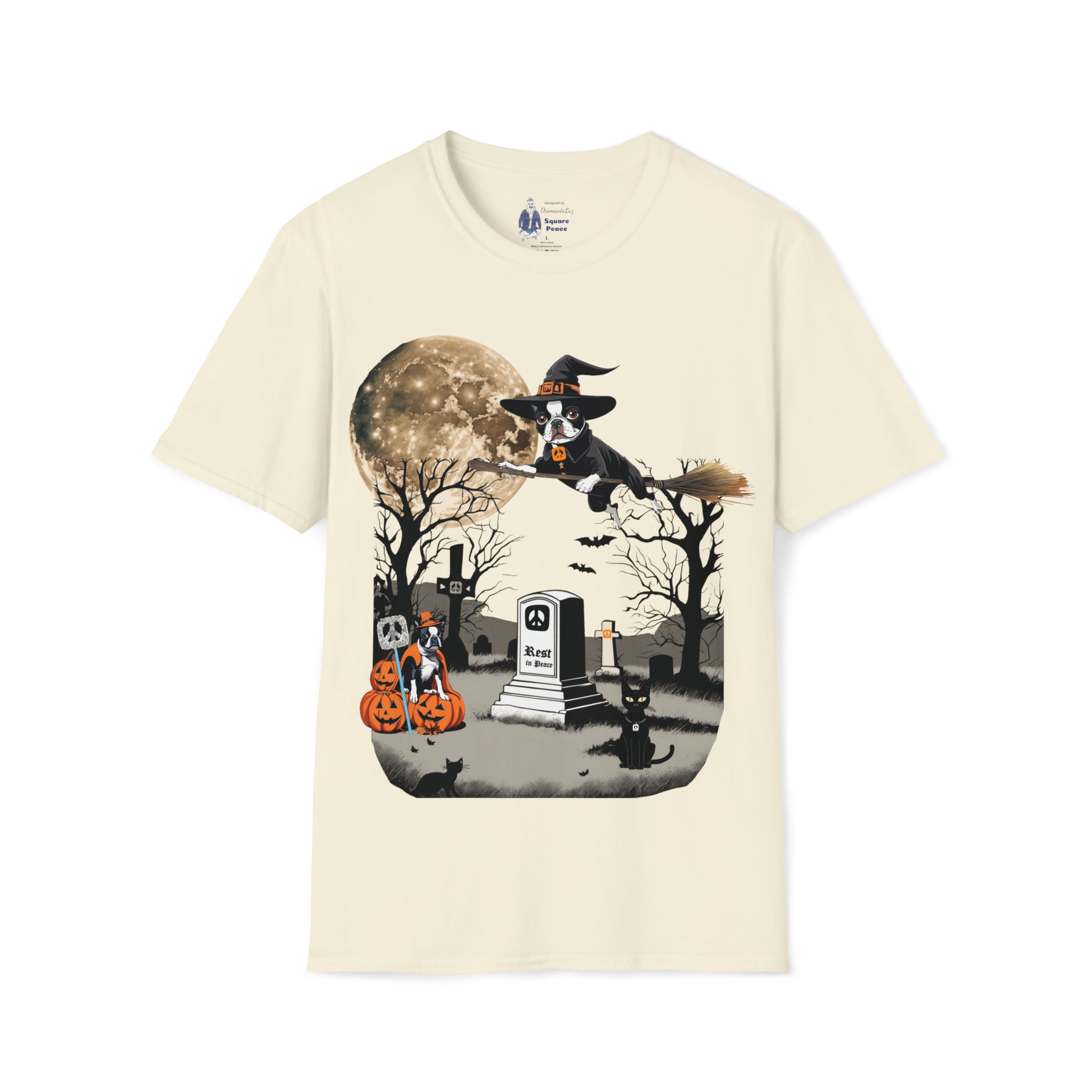 Nothing brings peace, love, and joy like our pets. Once we fall into slumber, who knows what our pets might be up to. The depicted Halloween night is not one of terror but of Terrier, specifically Boston Terriers. A Boston Terrier is flying the night sky on the lookout for Halloween treats. Her BT pal is sits atop a carved jack-o-lantern looking stylish dressed in a festive Halloween cape with matching hat. Hanging out with the pack is their feline friend who doesn't seem to realize he is not a dog. Have fun with the spirit of Halloween dressed in a festive Night of Terrier Halloween shirt. This tongue-in-cheek mash-up of Peace and Halloween is intended to trigger smiles. Wishing you peace, love, and ART!!!