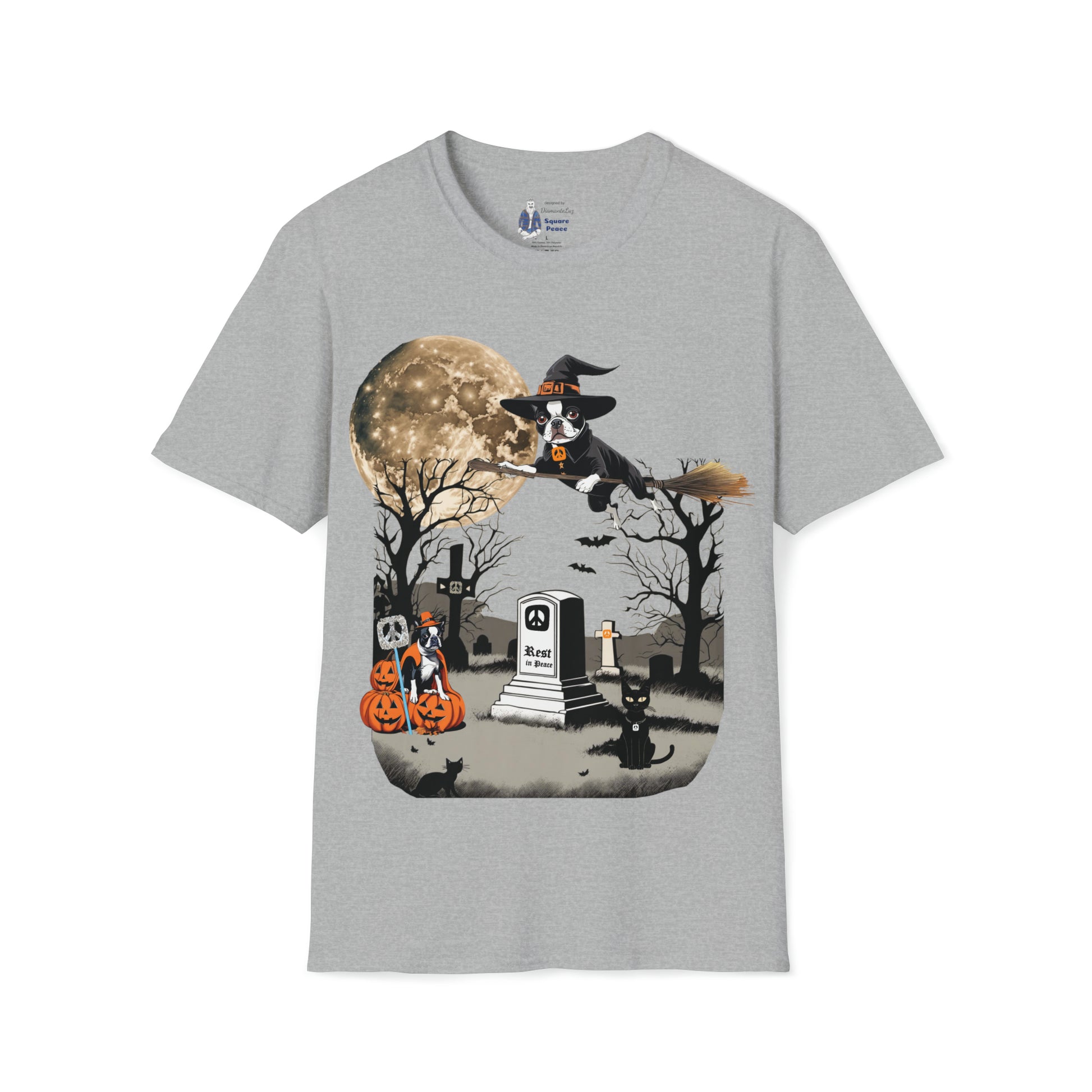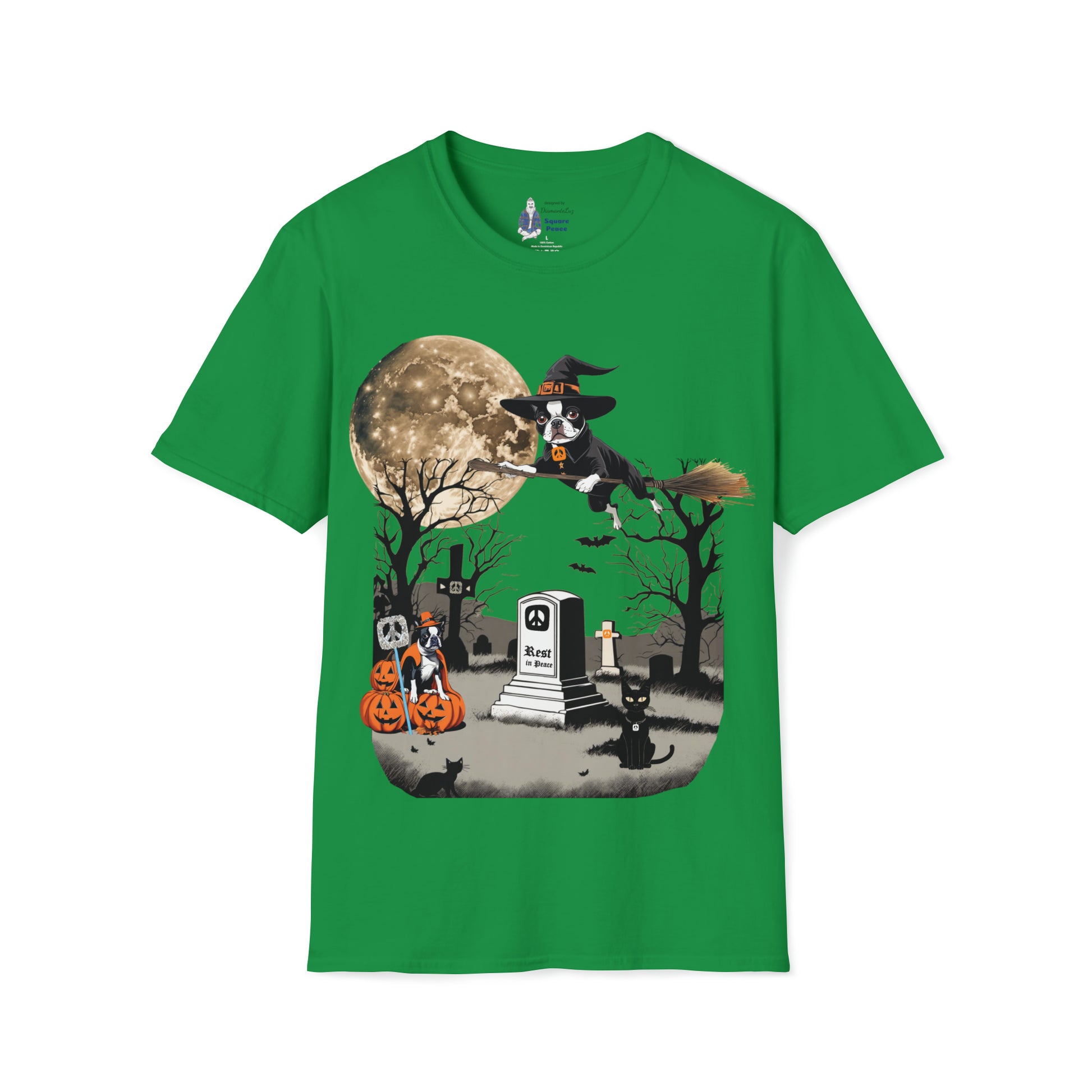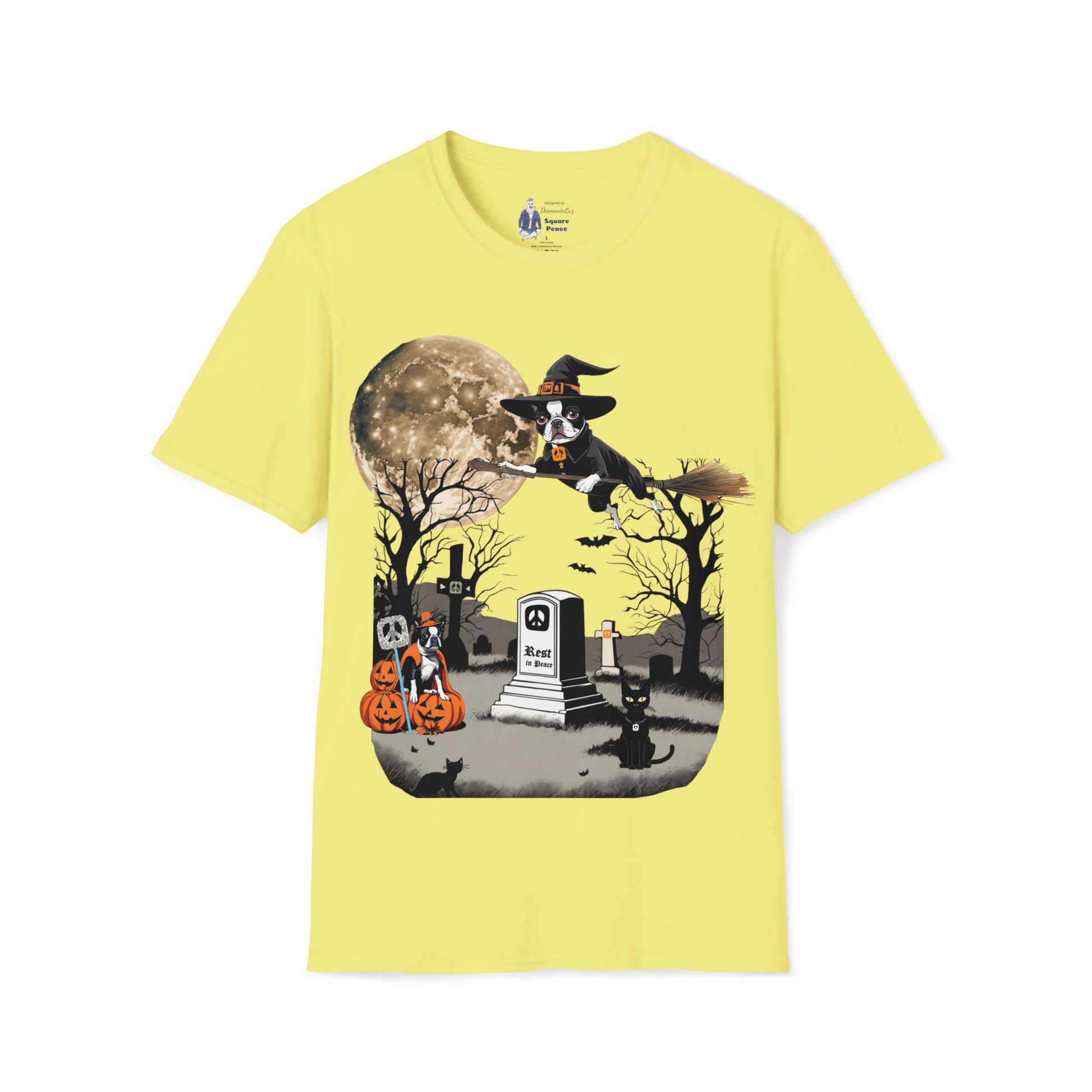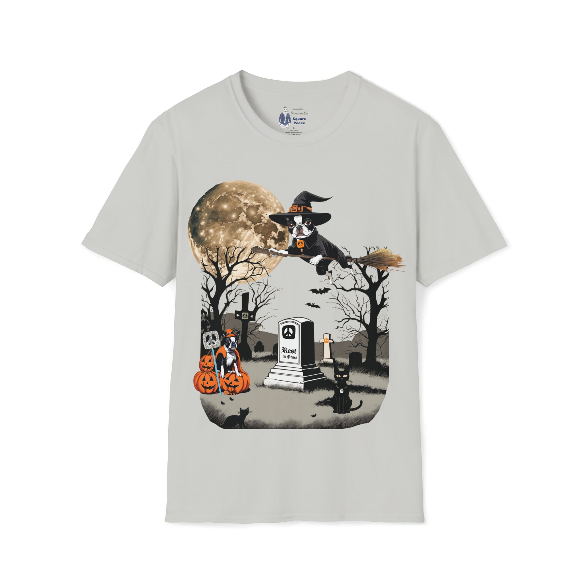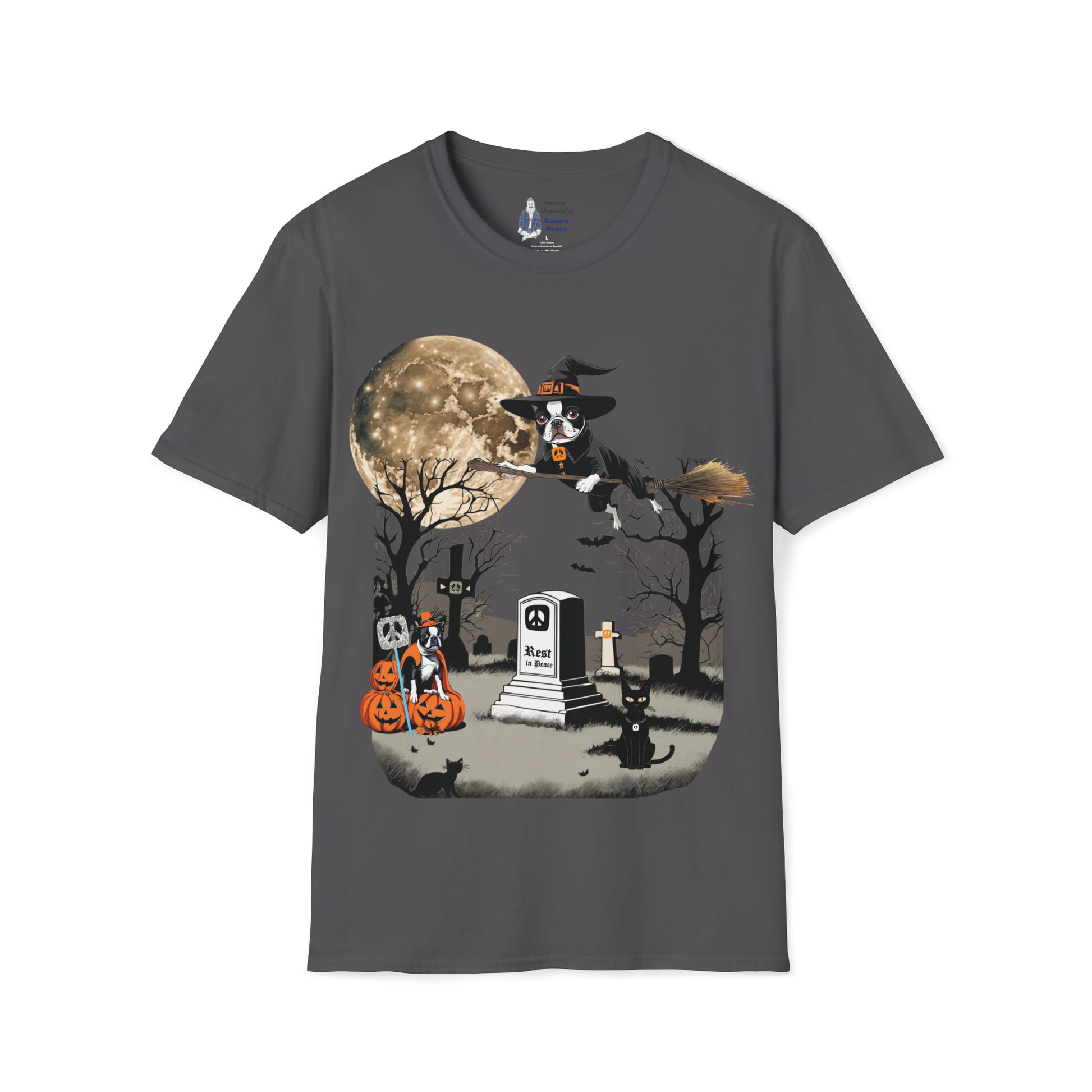 Nothing brings peace, love, and joy like our pets. Once we fall into slumber, who knows what our pets might be up to. The depicted Halloween night is not one of terror but of Terrier, specifically Boston Terriers. A Boston Terrier is flying the night sky on the lookout for Halloween treats. Her BT pal is sits atop a carved jack-o-lantern looking stylish dressed in a festive Halloween cape with matching hat. Hanging out with the pack is their feline friend who doesn't seem to realize he is not a dog. Have fun with the spirit of Halloween dressed in a festive Night of Terrier Halloween shirt. This tongue-in-cheek mash-up of Peace and Halloween is intended to trigger smiles. Wishing you peace, love, and ART!!!
