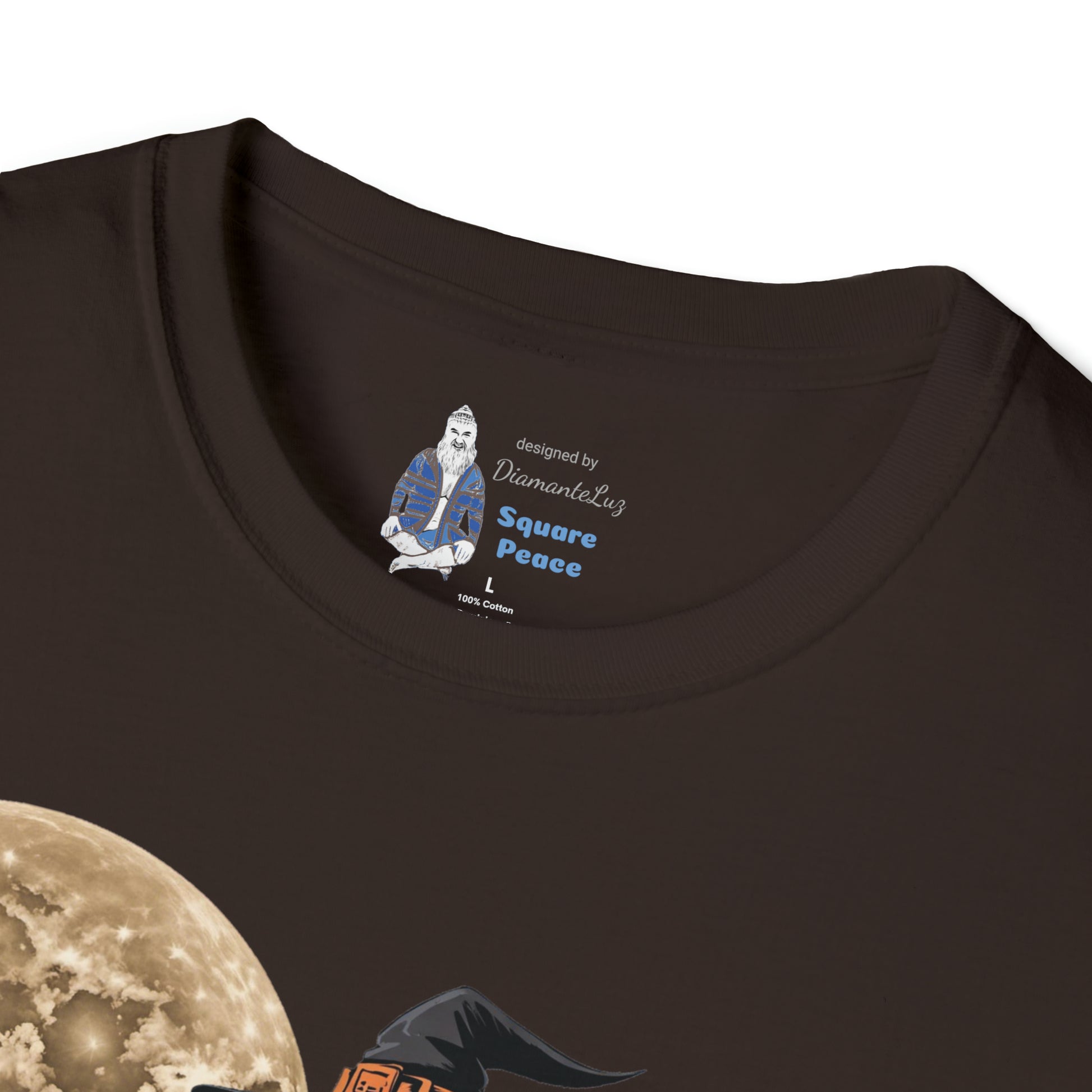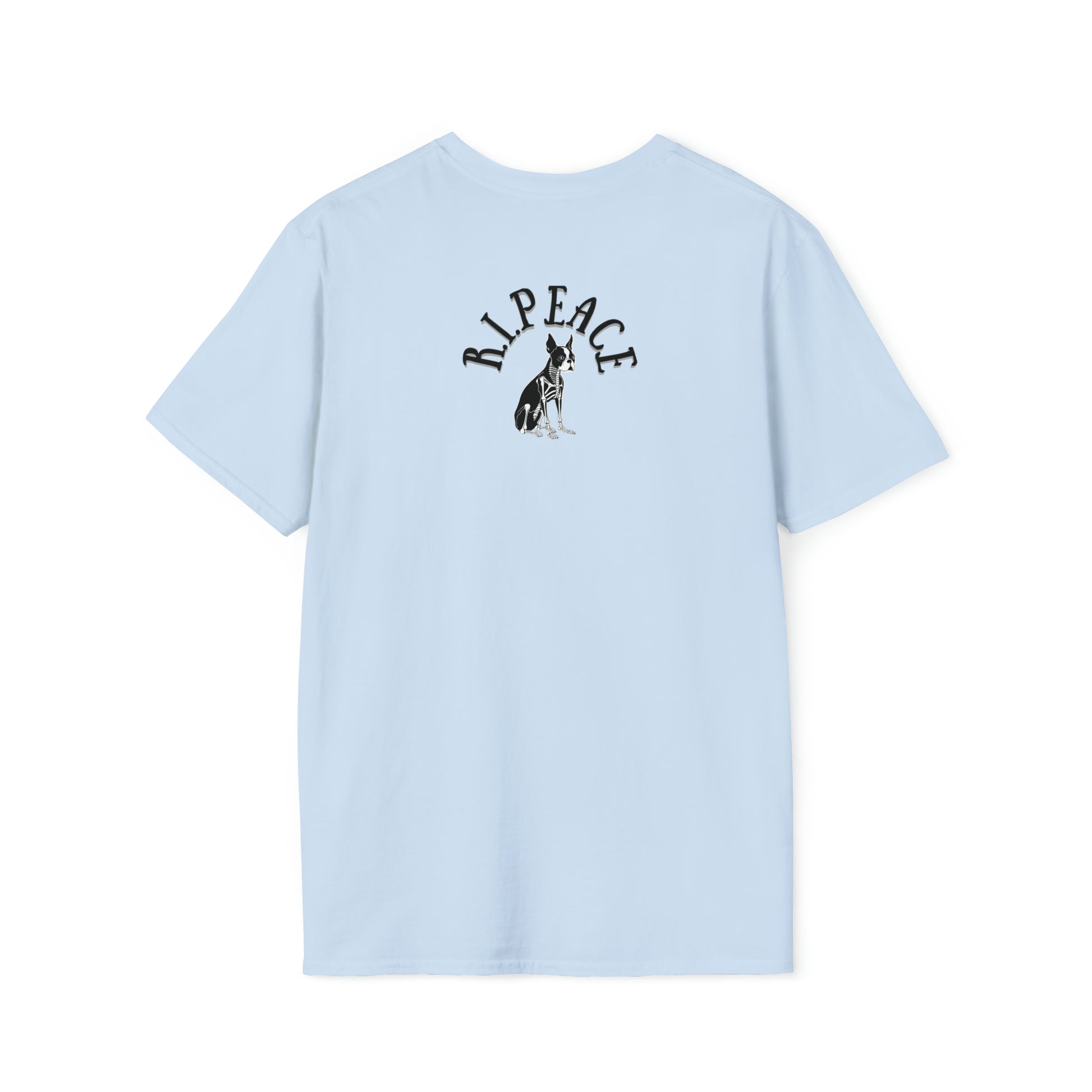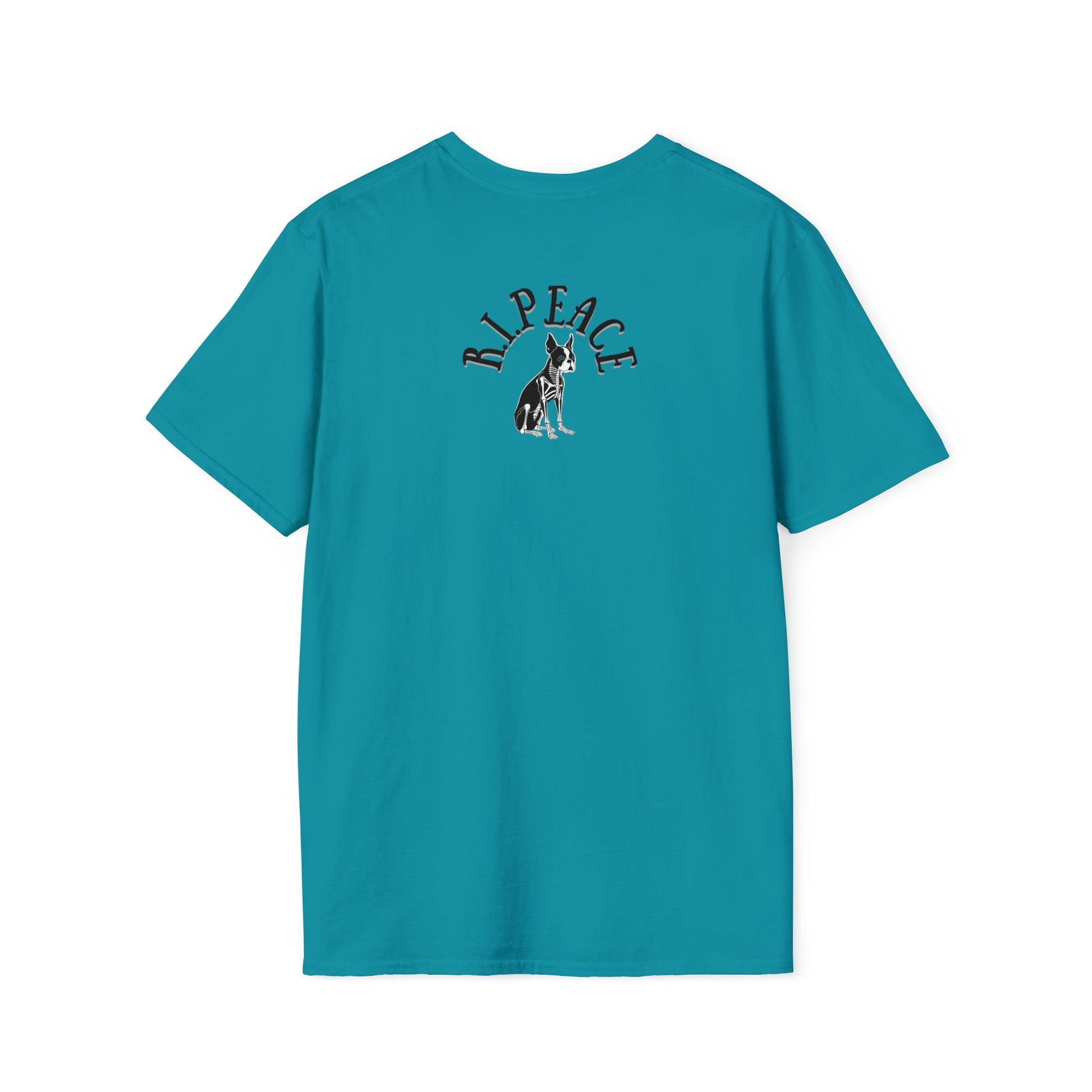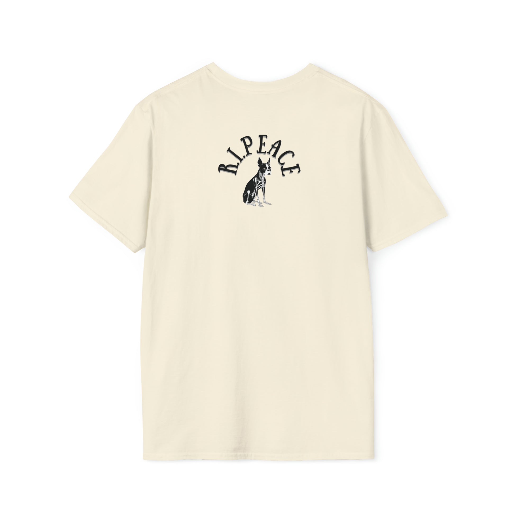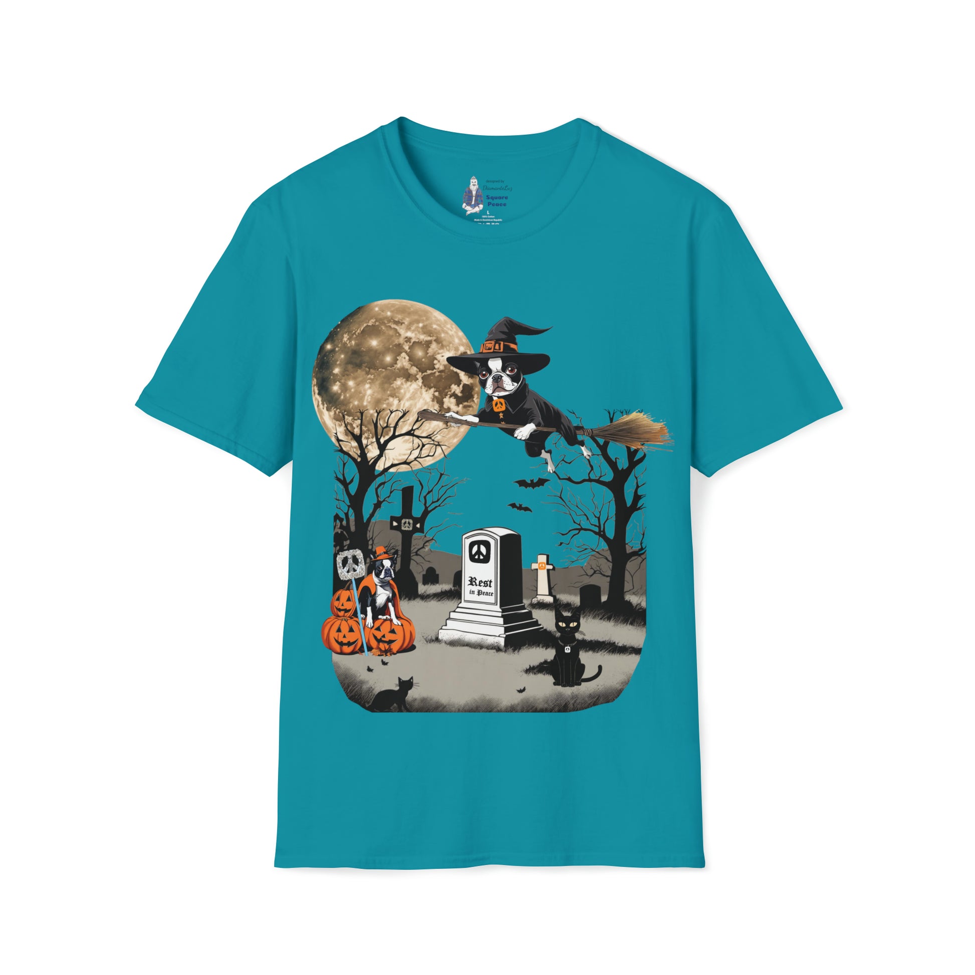 Nothing brings peace, love, and joy like our pets. Once we fall into slumber, who knows what our pets might be up to. The depicted Halloween night is not one of terror but of Terrier, specifically Boston Terriers. A Boston Terrier is flying the night sky on the lookout for Halloween treats. Her BT pal is sits atop a carved jack-o-lantern looking stylish dressed in a festive Halloween cape with matching hat. Hanging out with the pack is their feline friend who doesn't seem to realize he is not a dog. Have fun with the spirit of Halloween dressed in a festive Night of Terrier Halloween shirt. This tongue-in-cheek mash-up of Peace and Halloween is intended to trigger smiles. Wishing you peace, love, and ART!!!