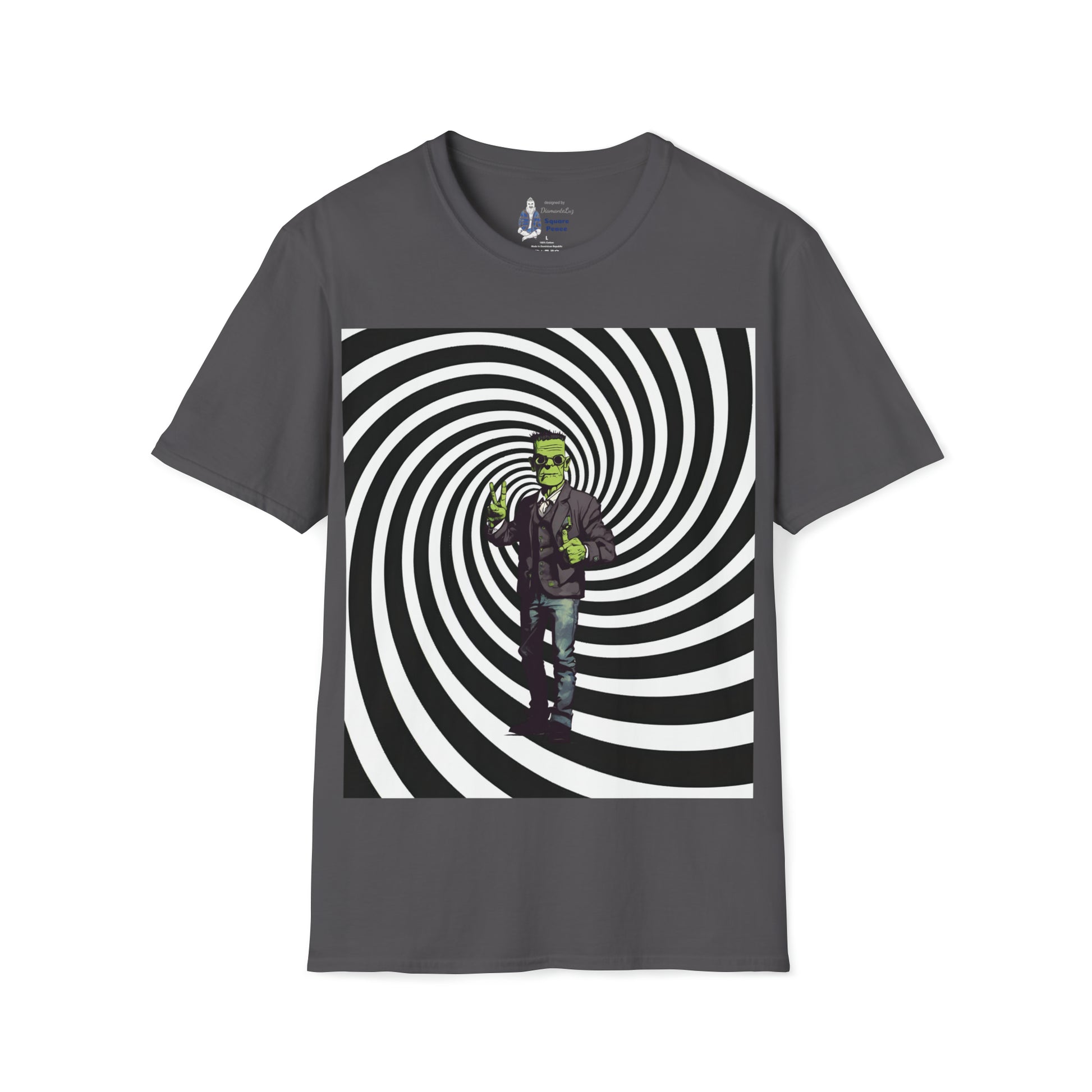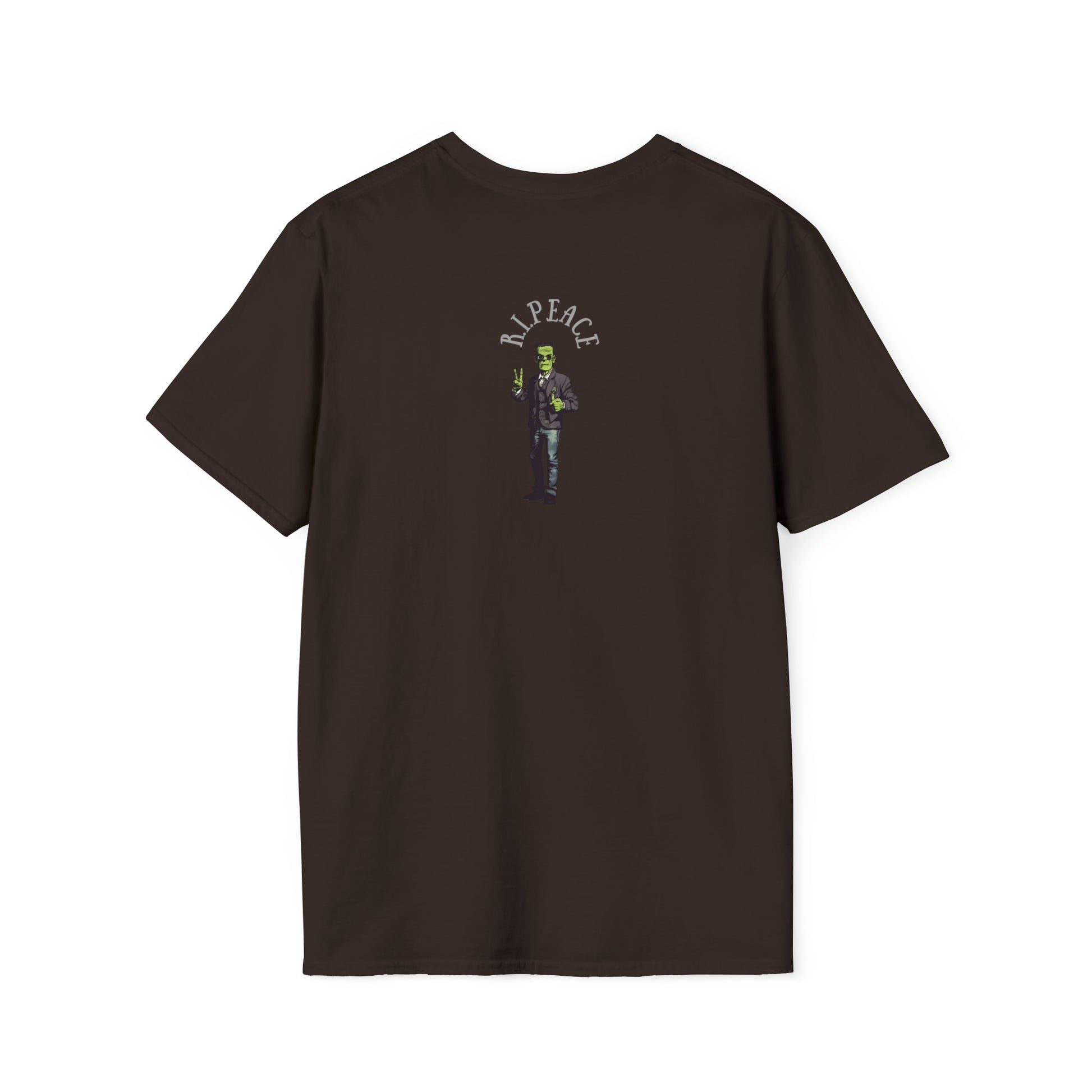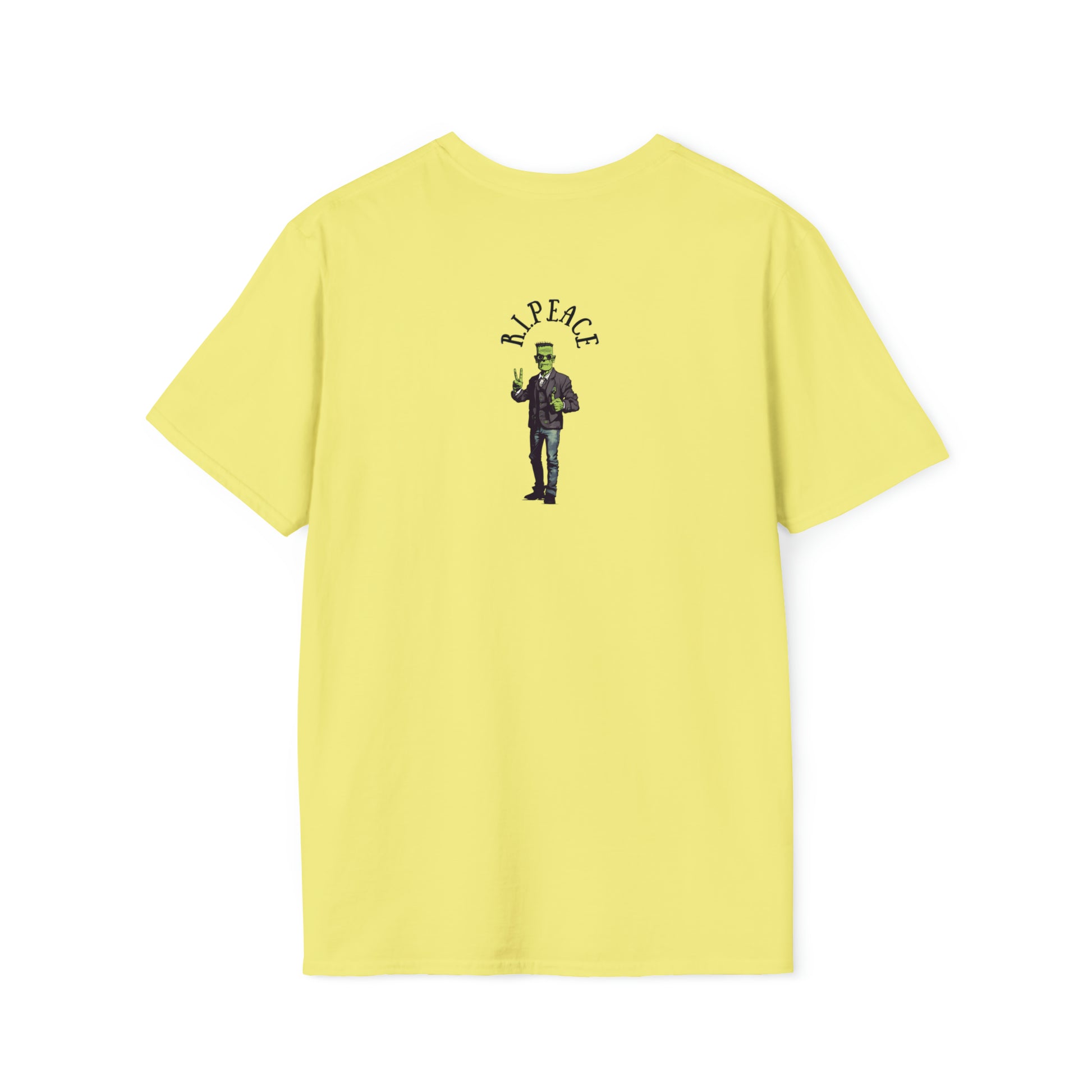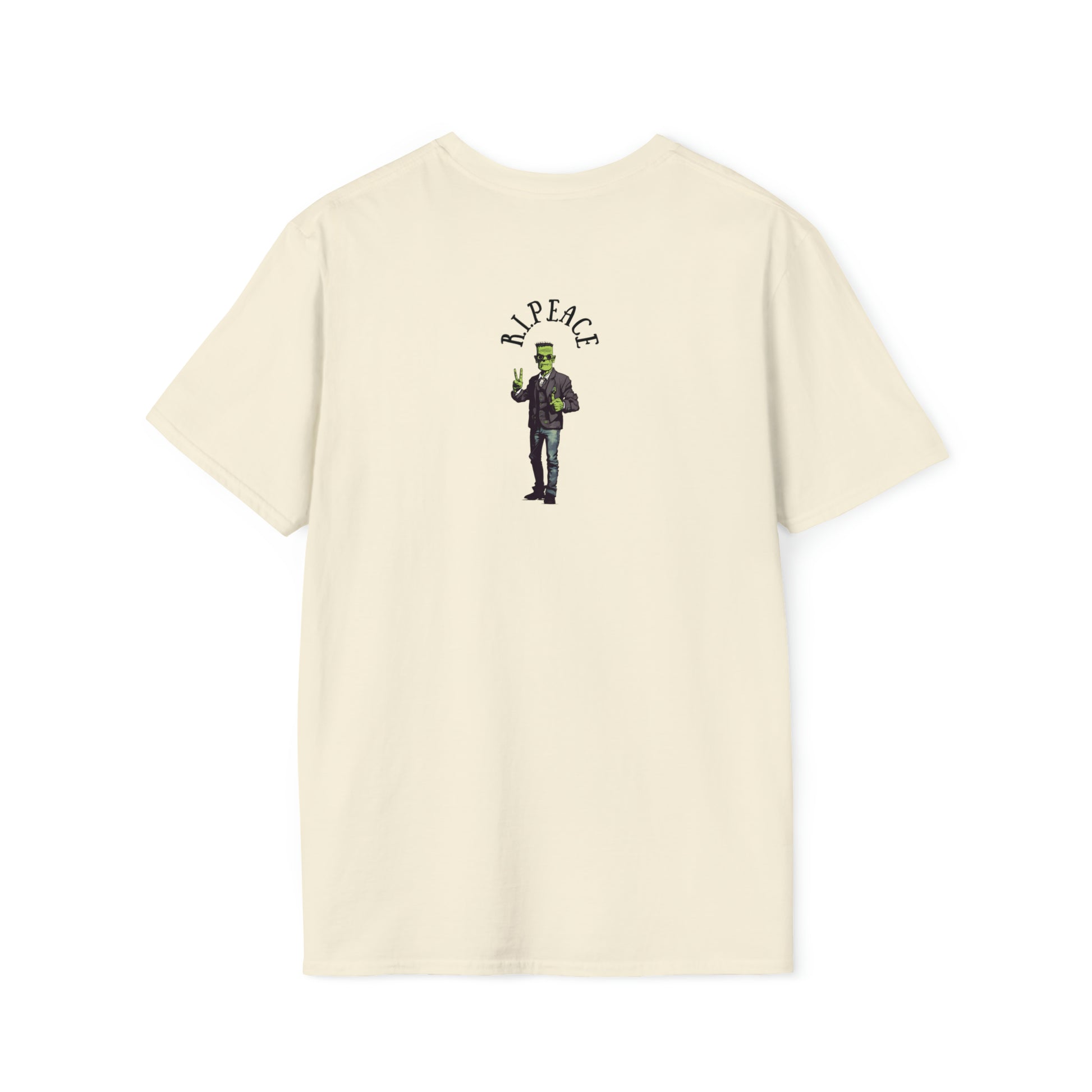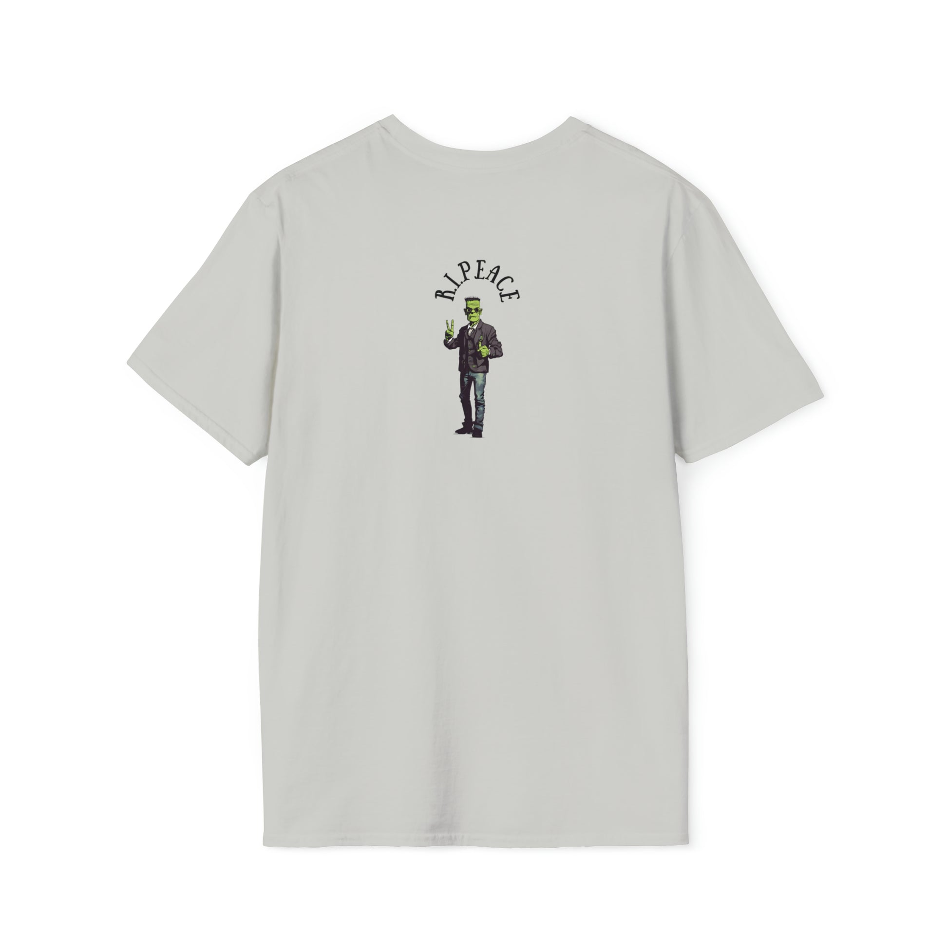 Peace Sign Frankenstein is an attempt to have fun with the spirit of Halloween while spreading peace. Frankenstein is flashing a hand peace sign in front of a spiraling vortex. A smaller Peace Sign Frankenstein is on the back of the shirt under the R.I.Peace moniker. I hope you enjoy this tongue-in-cheek approach to Halloween. Wishing you peace, love, and ART!!!