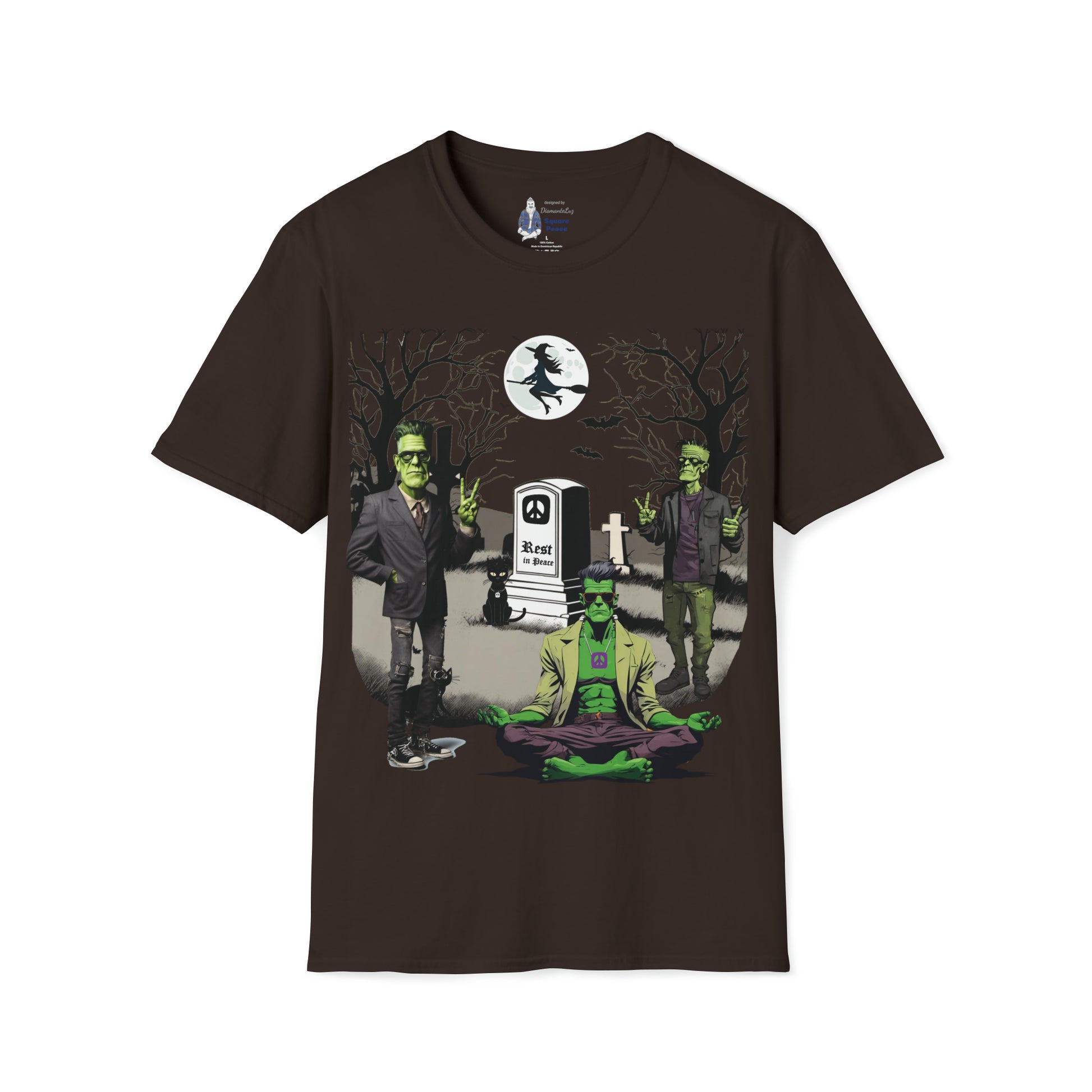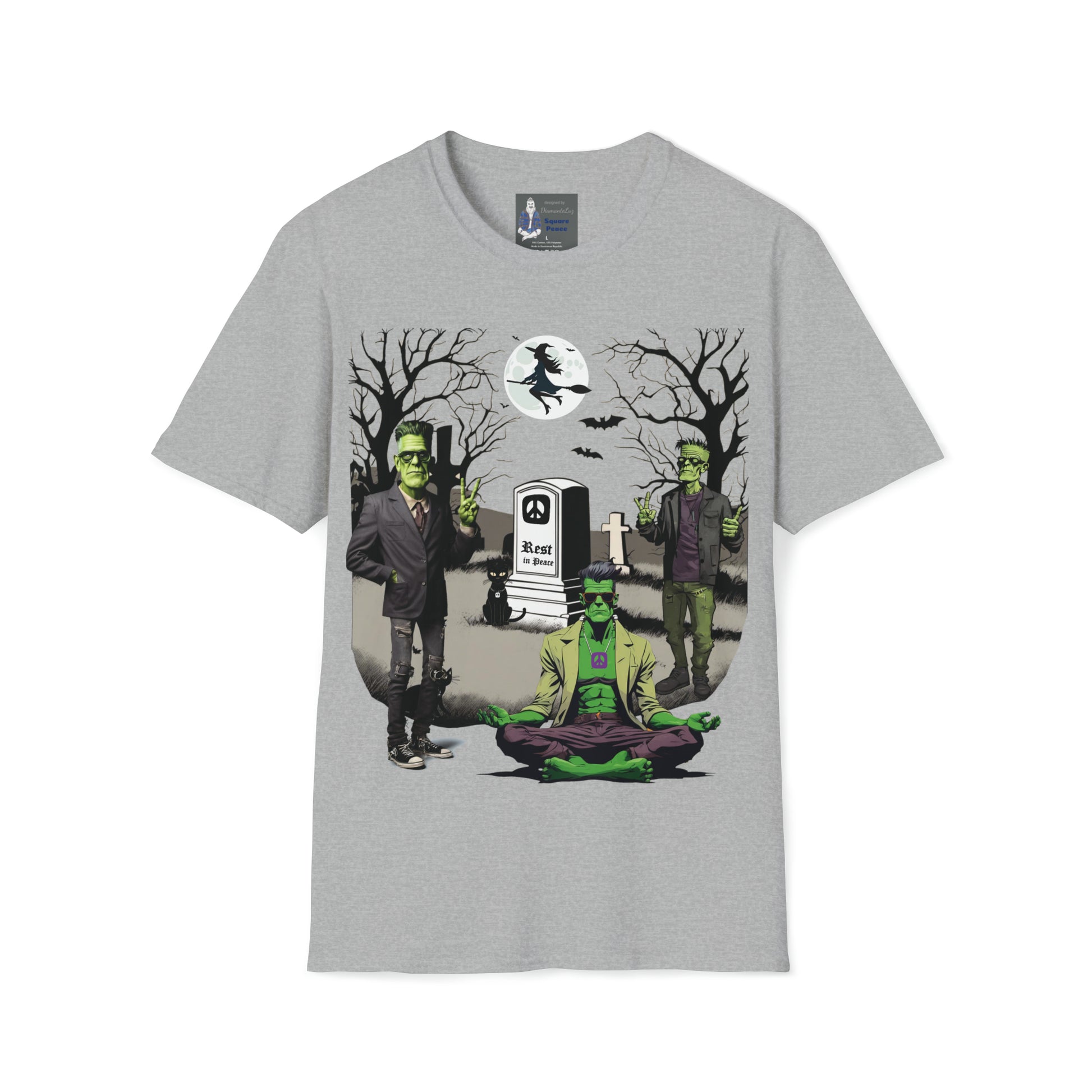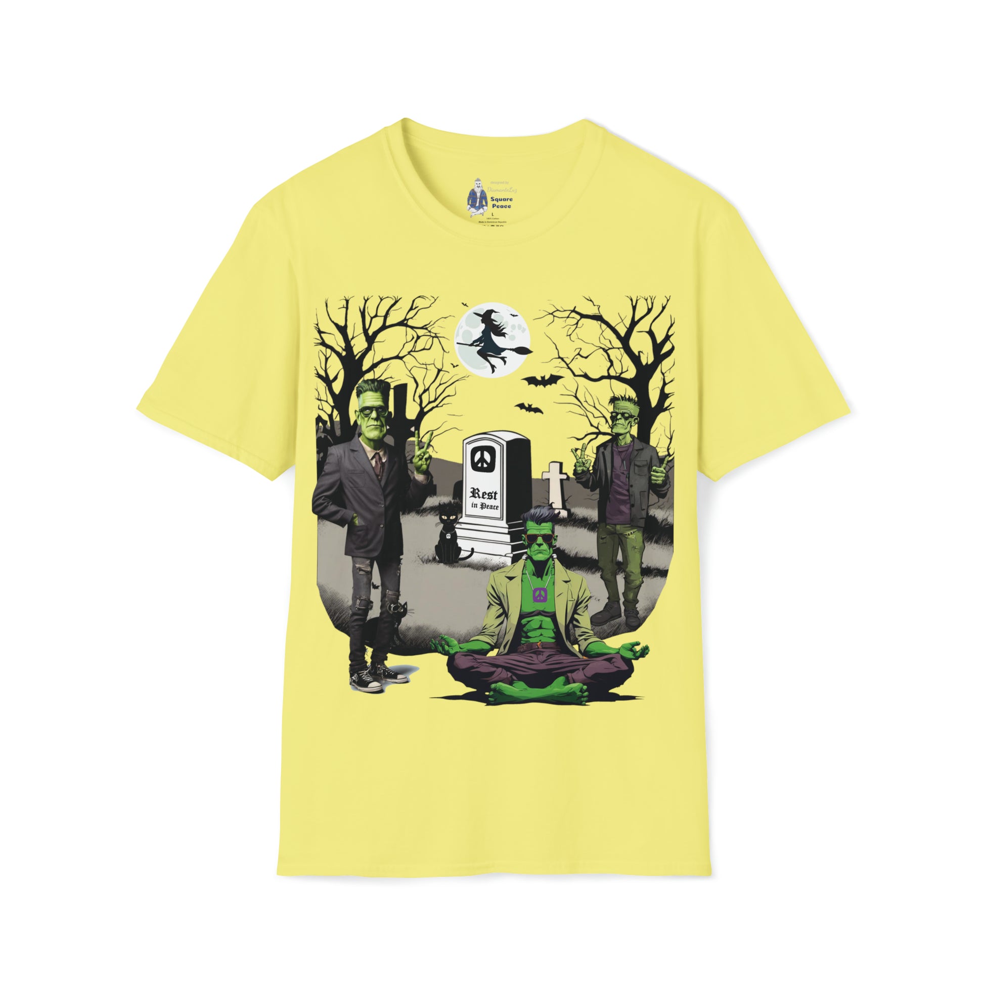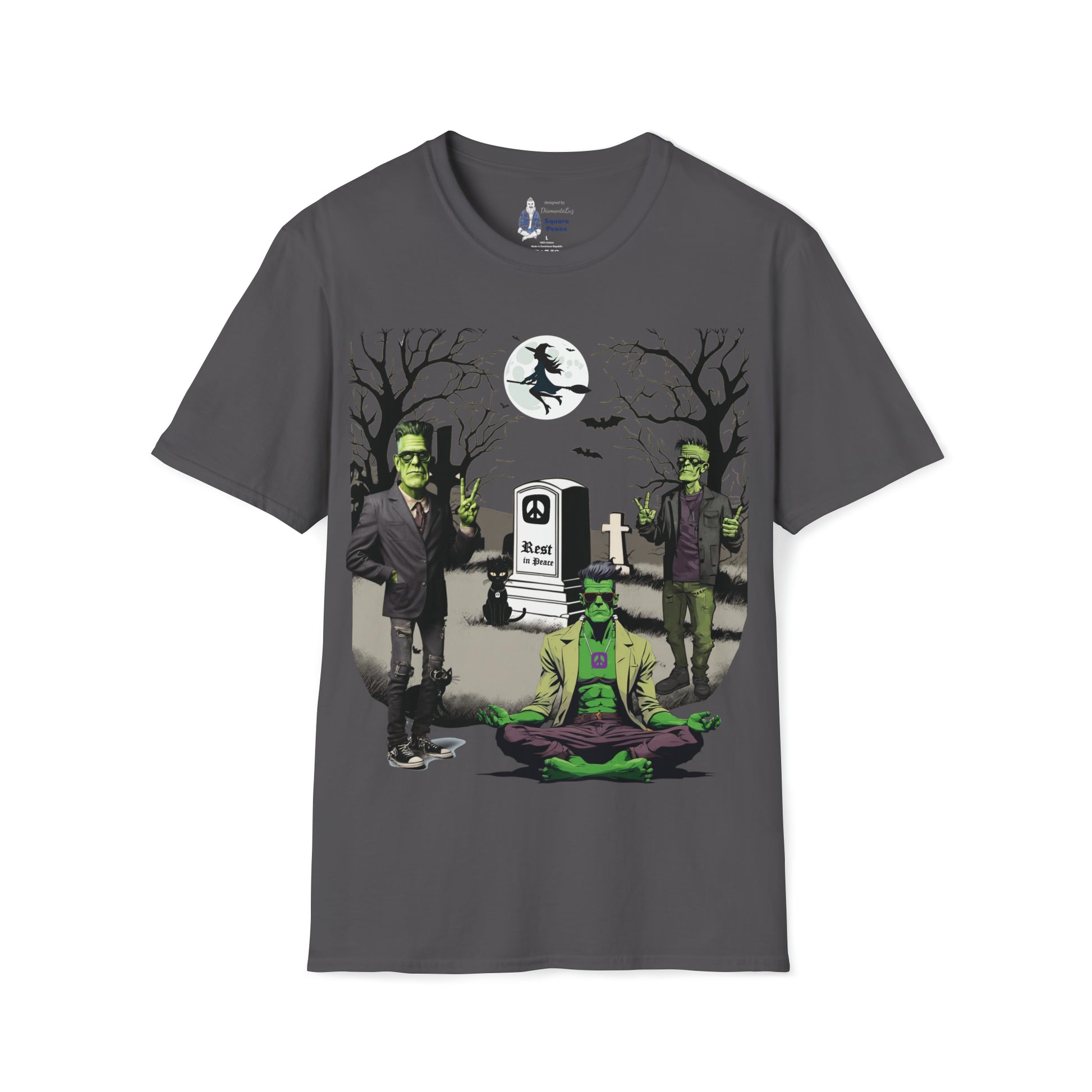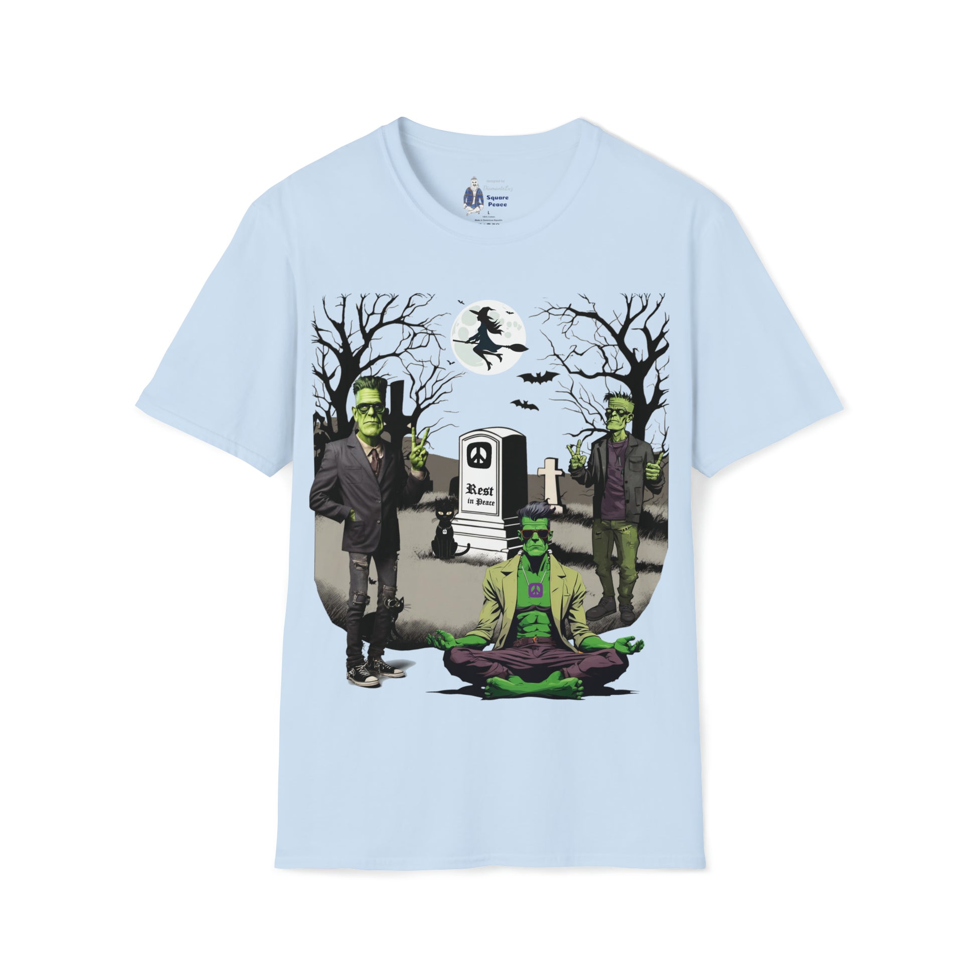 Rather than being a place of terror, this graveyard is a place of peace. The meditating Frankenstein has a friend on each side flashing a hand peace sign. The tombstone is marked with a Square Peace sign, and the words Rest in Peace. The spirit of peace fills the night. Have fun with the spirit of Halloween dressed in a festive Peace Signs & Frankensteins Halloween shirt. This tongue-in-cheek mash-up of Peace and Halloween is intended to trigger smiles. Wishing you peace, love, and ART!!!