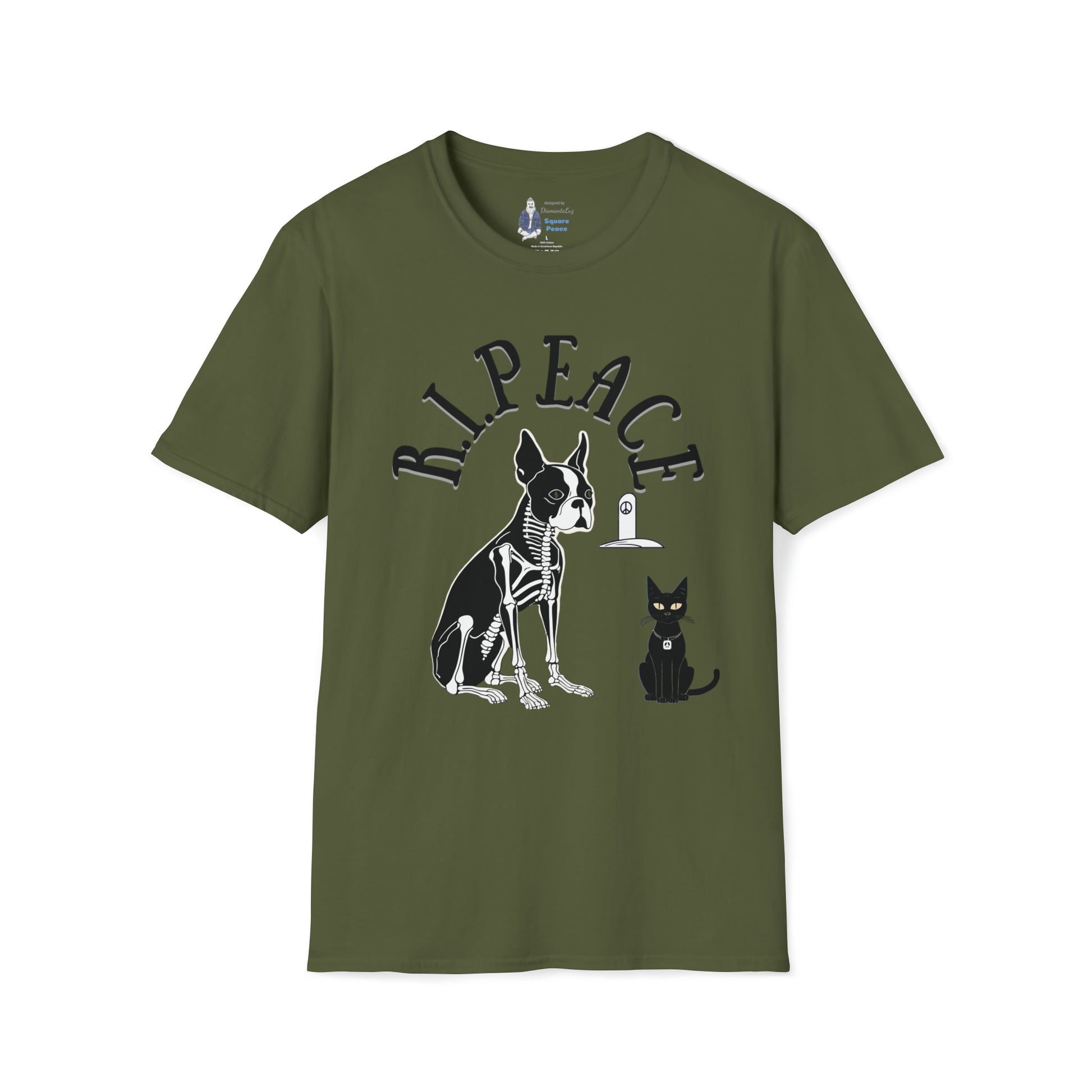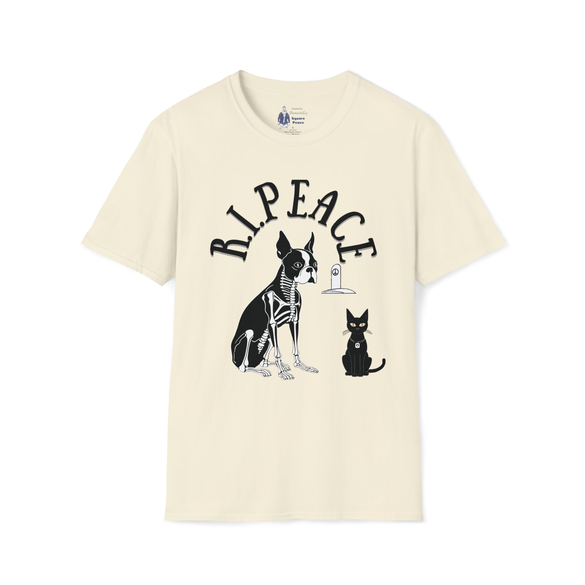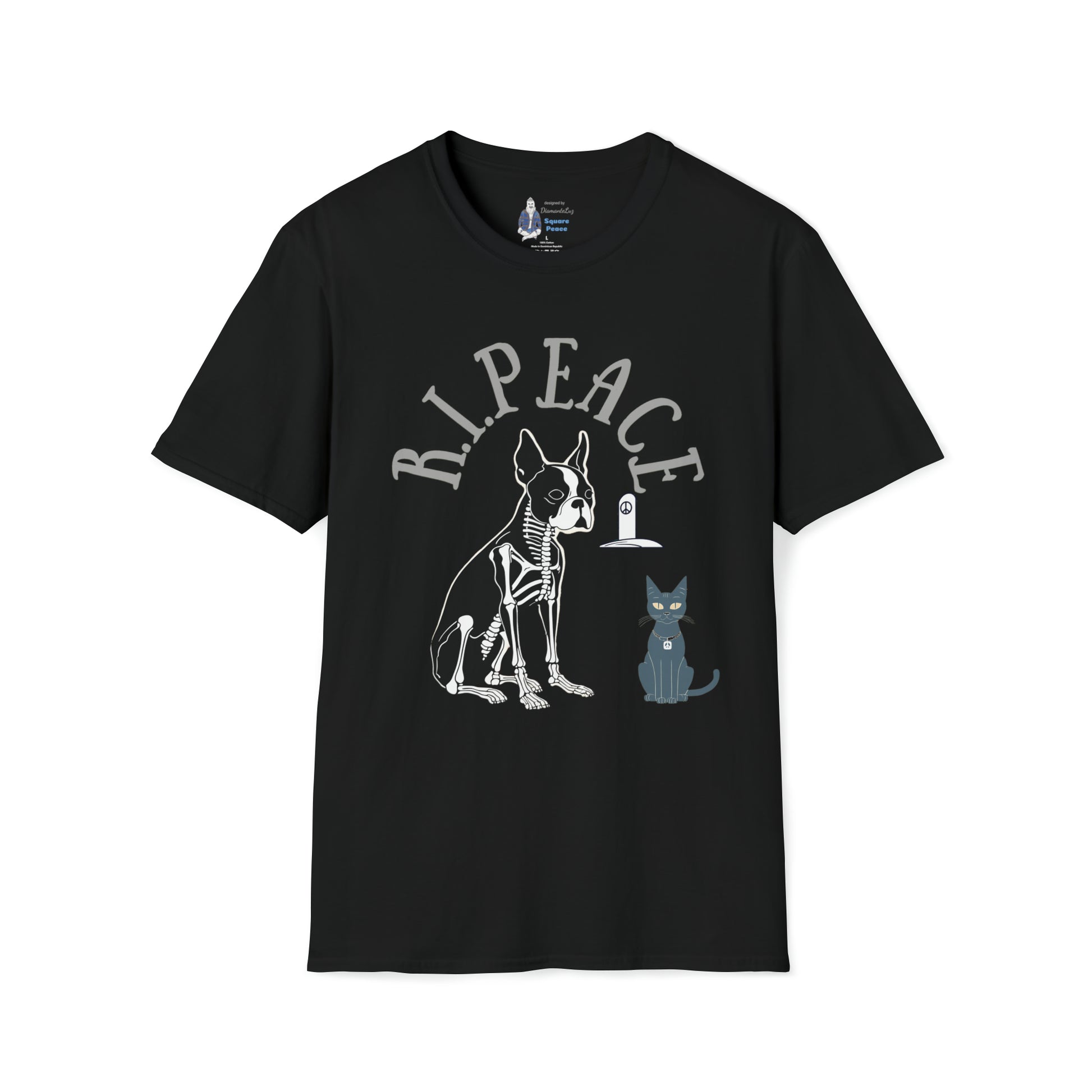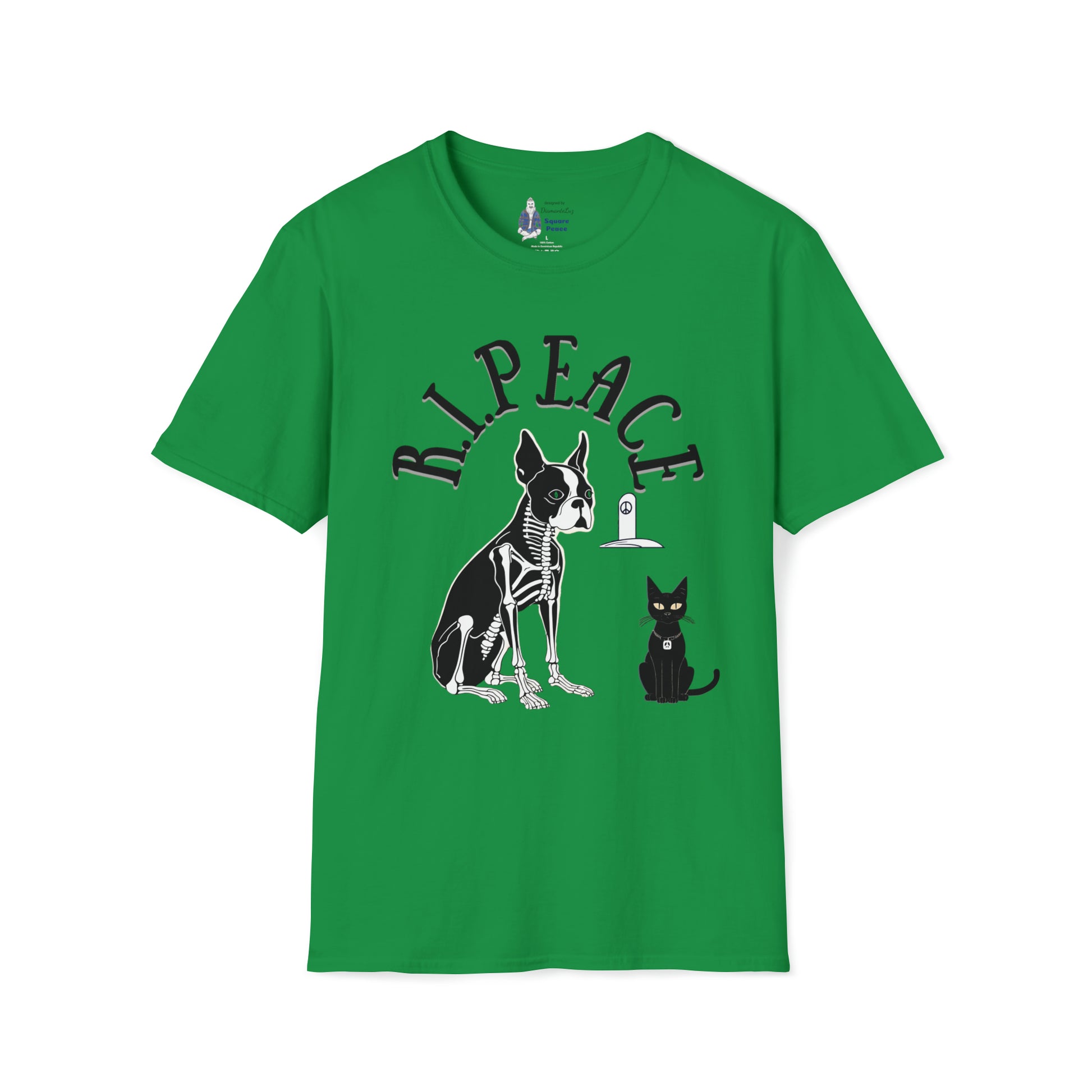 Nothing brings peace, love, and joy like our pets. This Boston Terrier sits guard in a graveyard. His feline friend can sense the presence of his Boston Terrier friend and sits with him this Halloween night. Have fun with the spirit of Halloween dressed in a R.I.Peace Boston Terrier Halloween shirt. This tongue-in-cheek mash-up of Peace and Halloween is intended to trigger smiles. Wishing you peace, love, and ART!!!