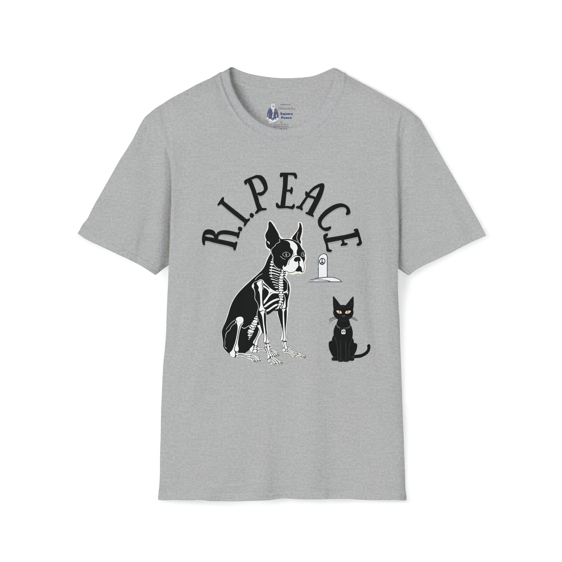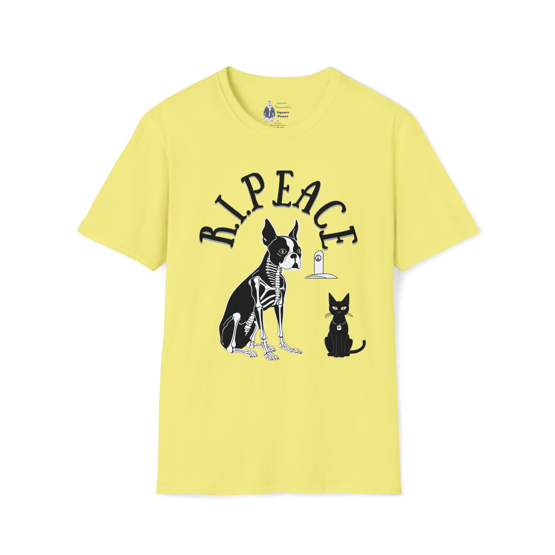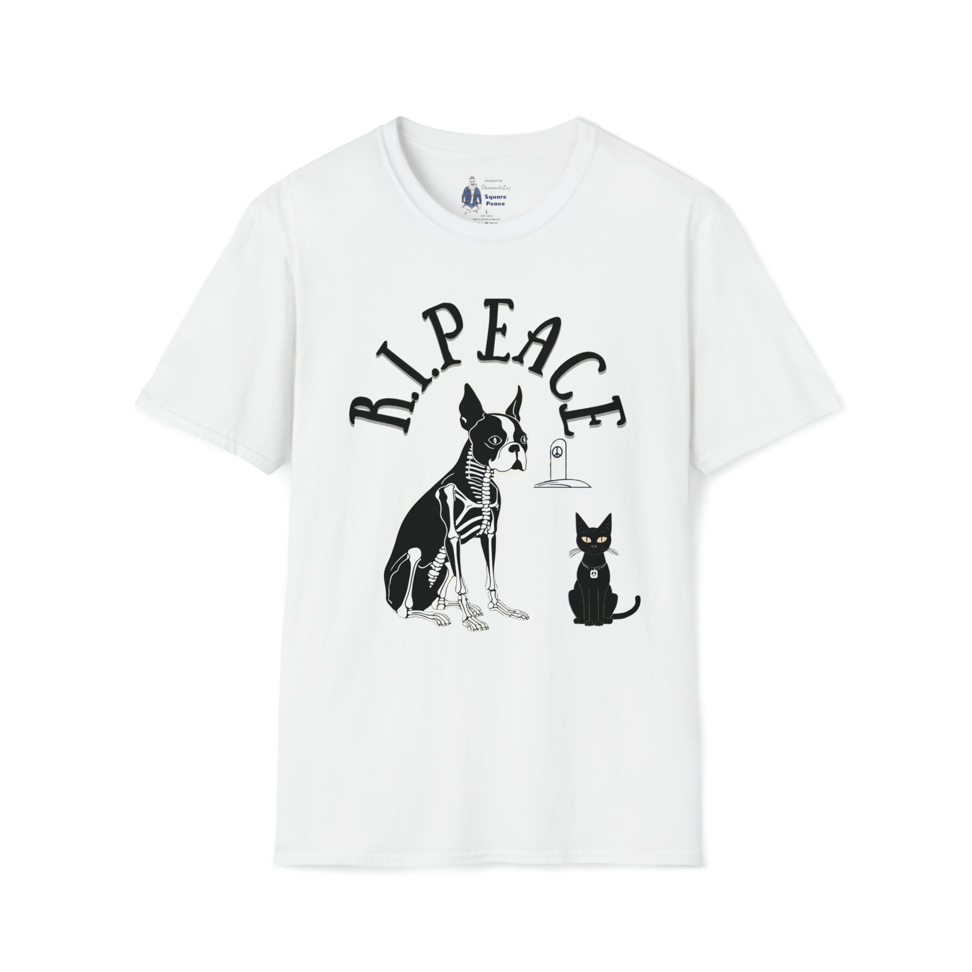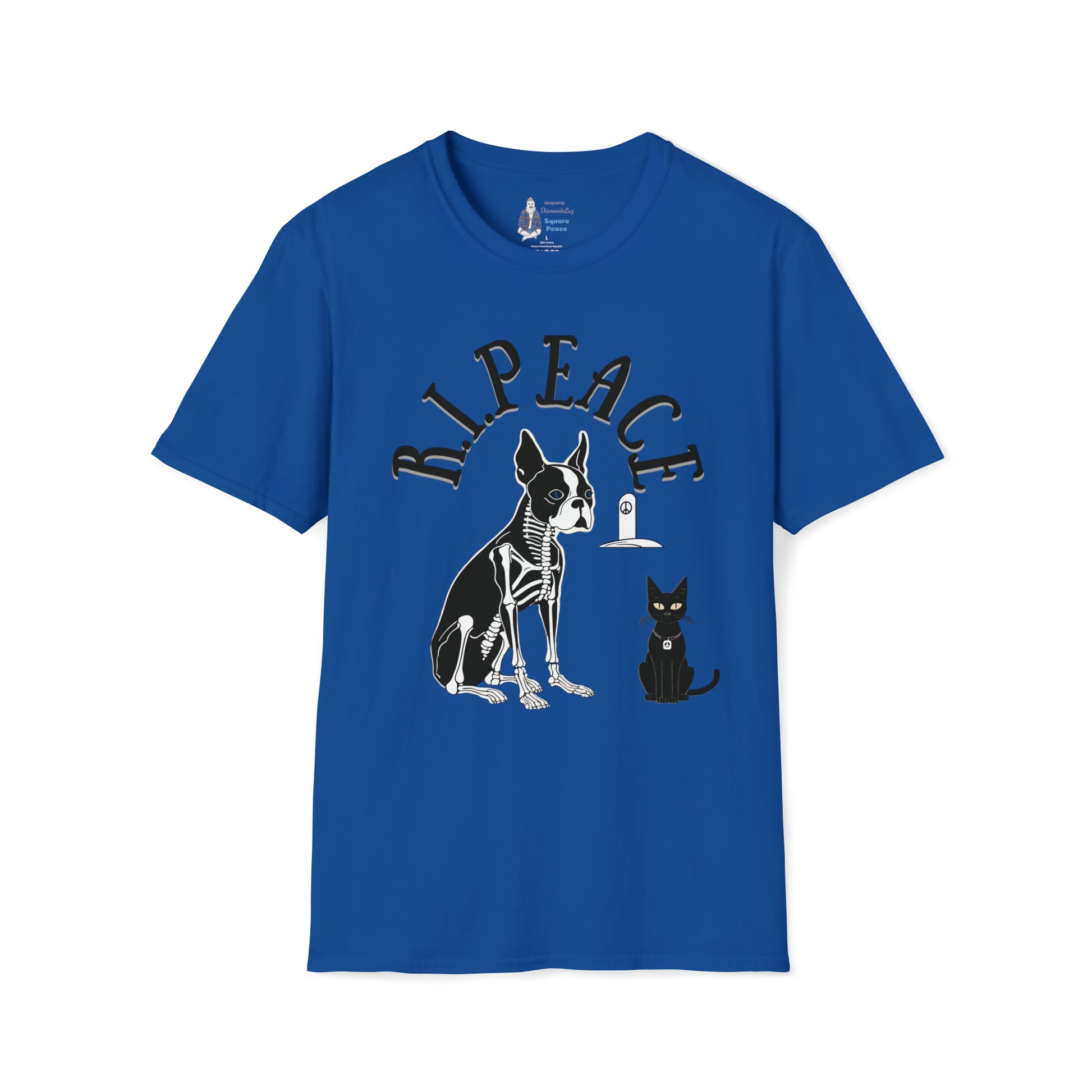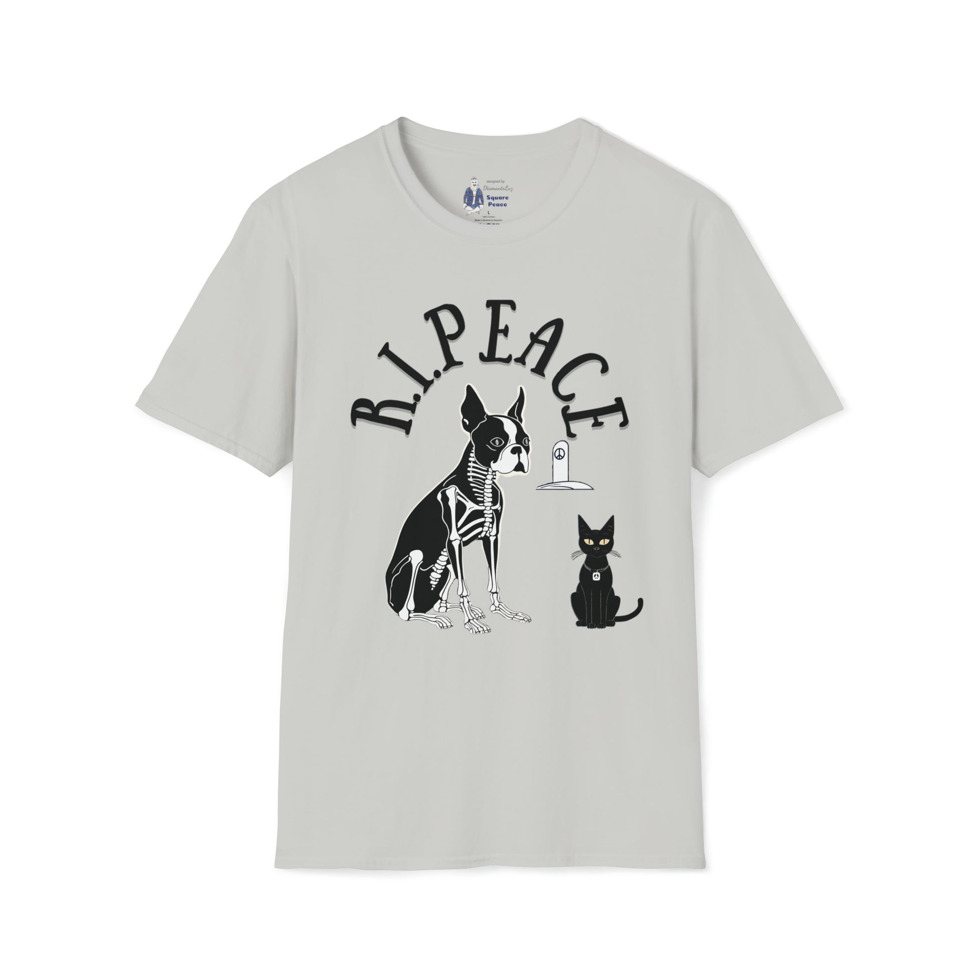 Nothing brings peace, love, and joy like our pets. This Boston Terrier sits guard in a graveyard. His feline friend can sense the presence of his Boston Terrier friend and sits with him this Halloween night. Have fun with the spirit of Halloween dressed in a R.I.Peace Boston Terrier Halloween shirt. This tongue-in-cheek mash-up of Peace and Halloween is intended to trigger smiles. Wishing you peace, love, and ART!!!