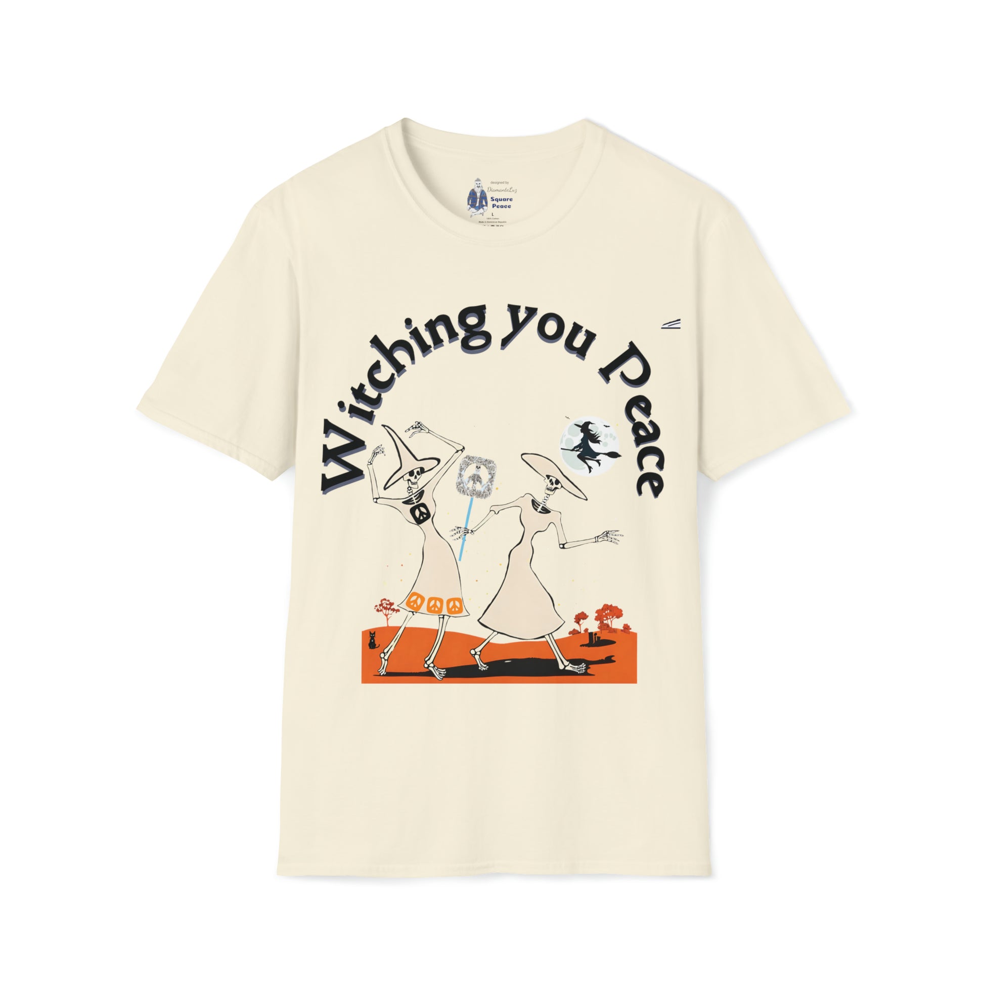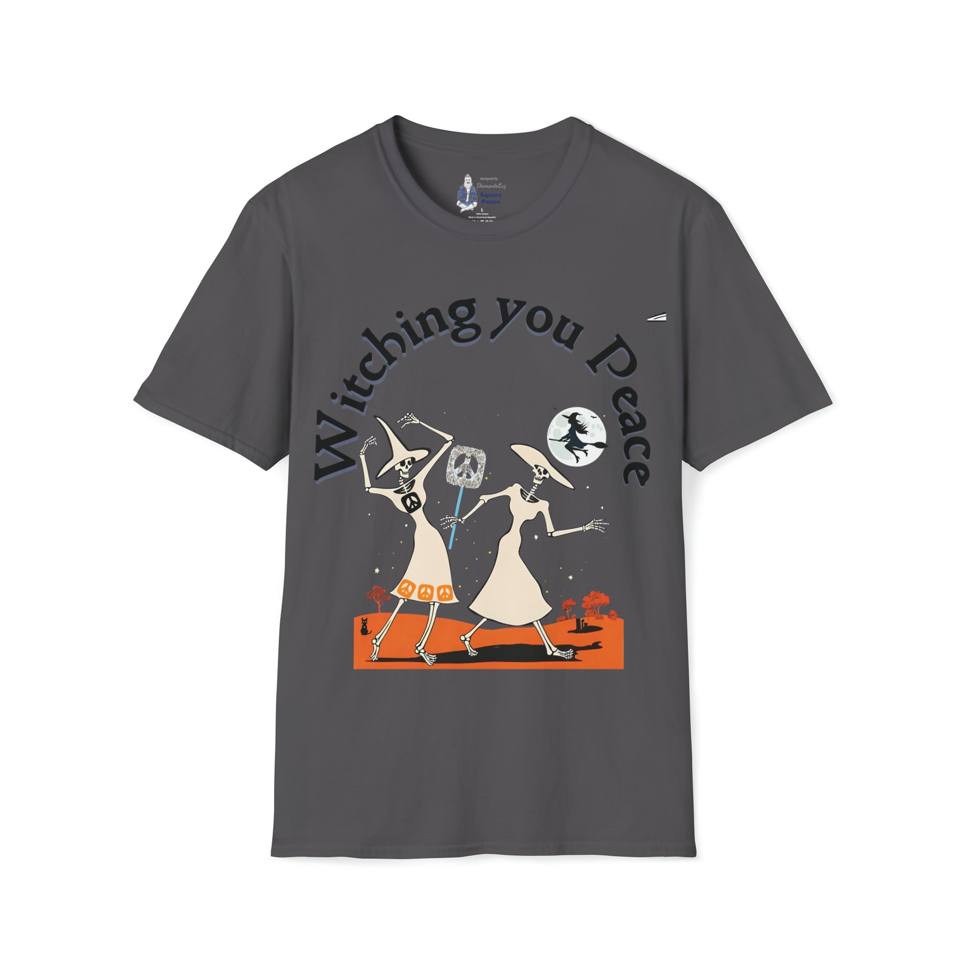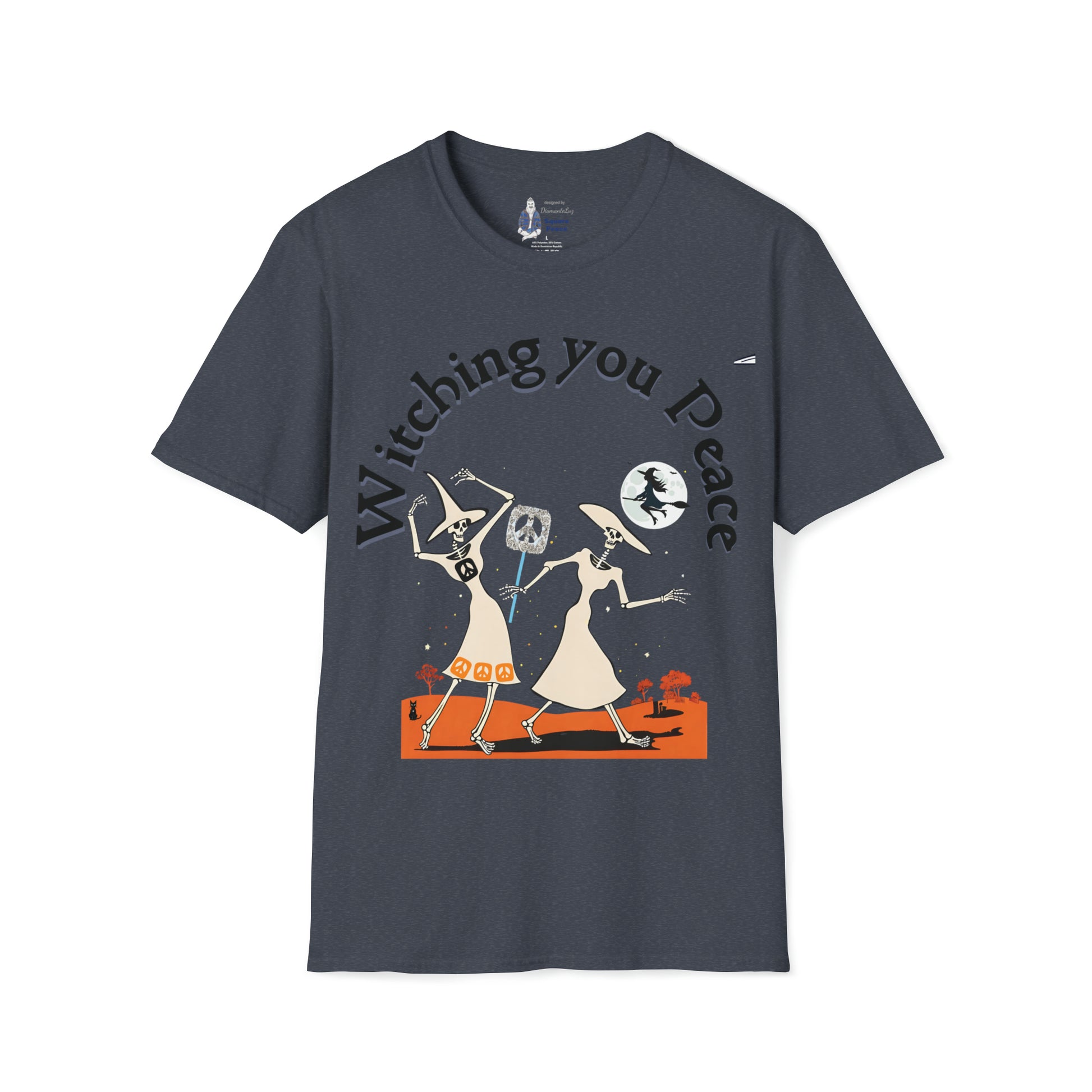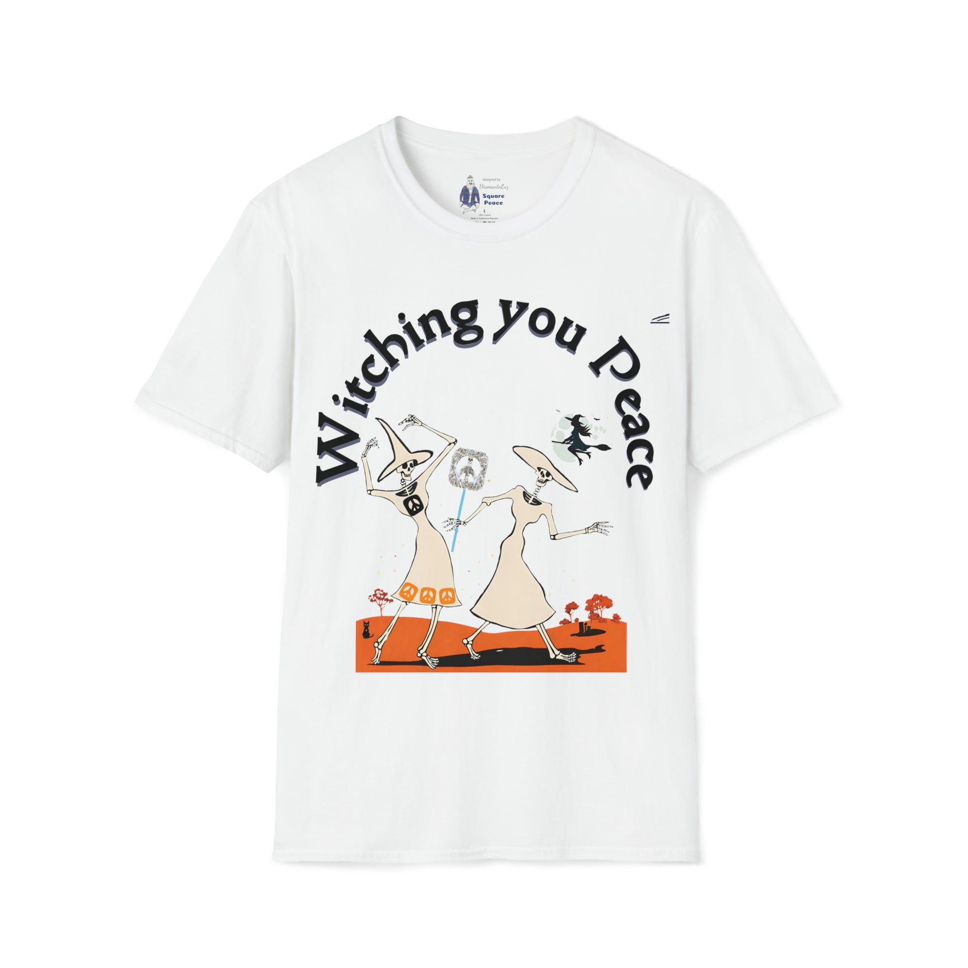 Have fun this Halloween and spread peace wearing your Witching You Peace T-Shirt for Halloween. This artist print shirt puts a new spin on casual comfort. Made from very soft materials, this tee is cotton and polyester. The shoulders have twill tape for improved durability. There are no side seams which provides extra comfort. The collar is made with ribbed knitting to prevent curling damage. This designer print is available on several different color shirts.
