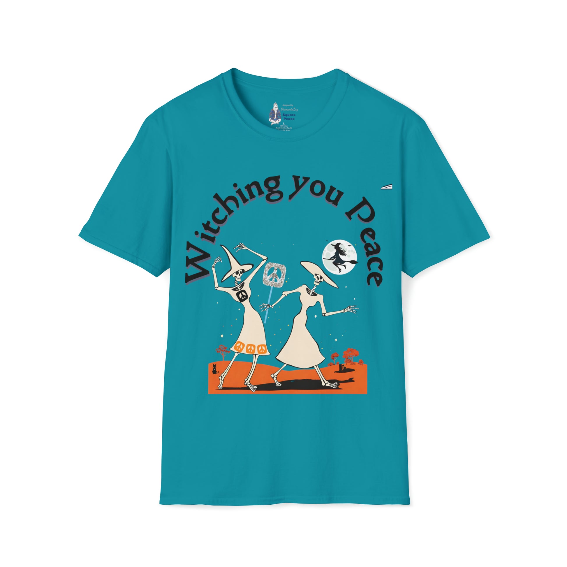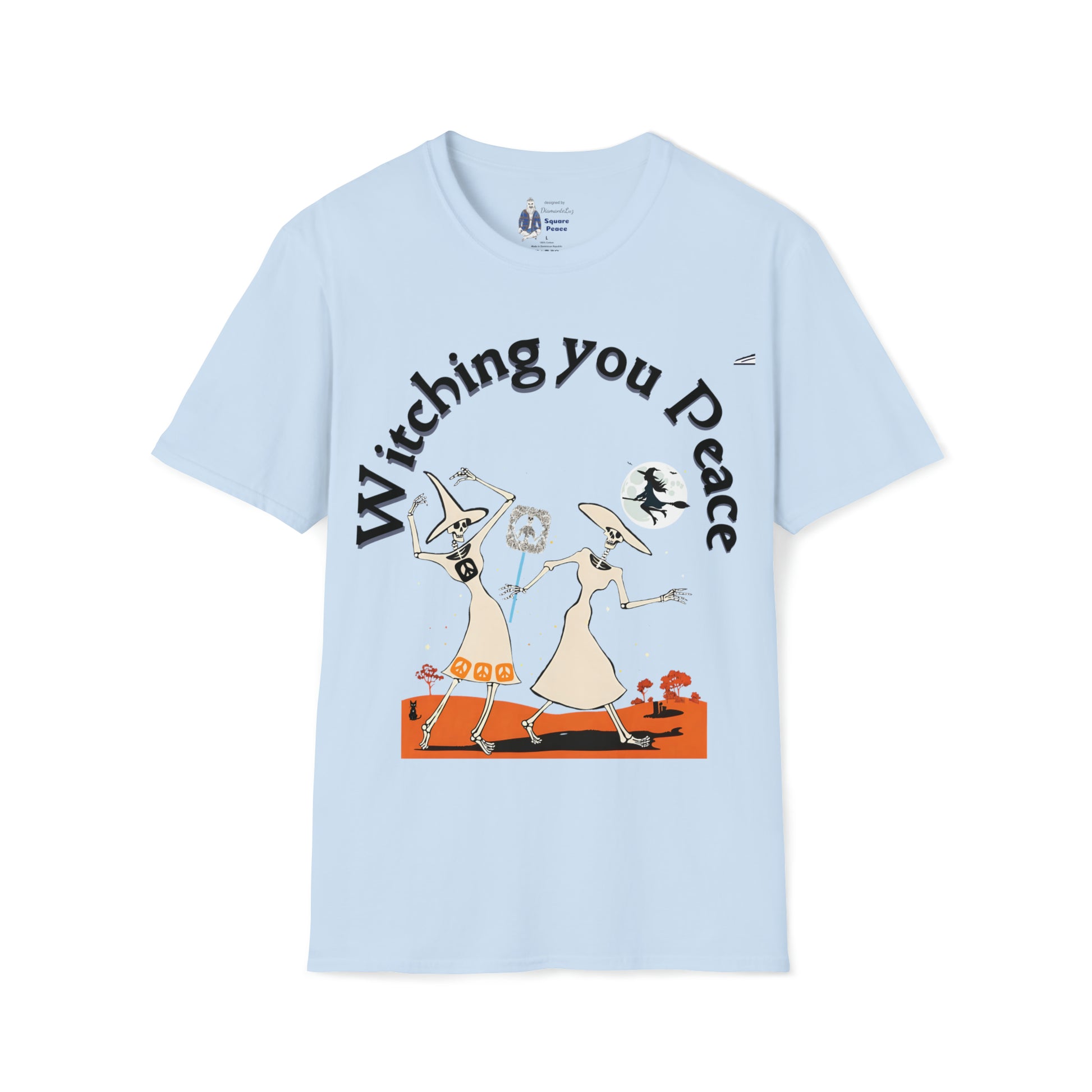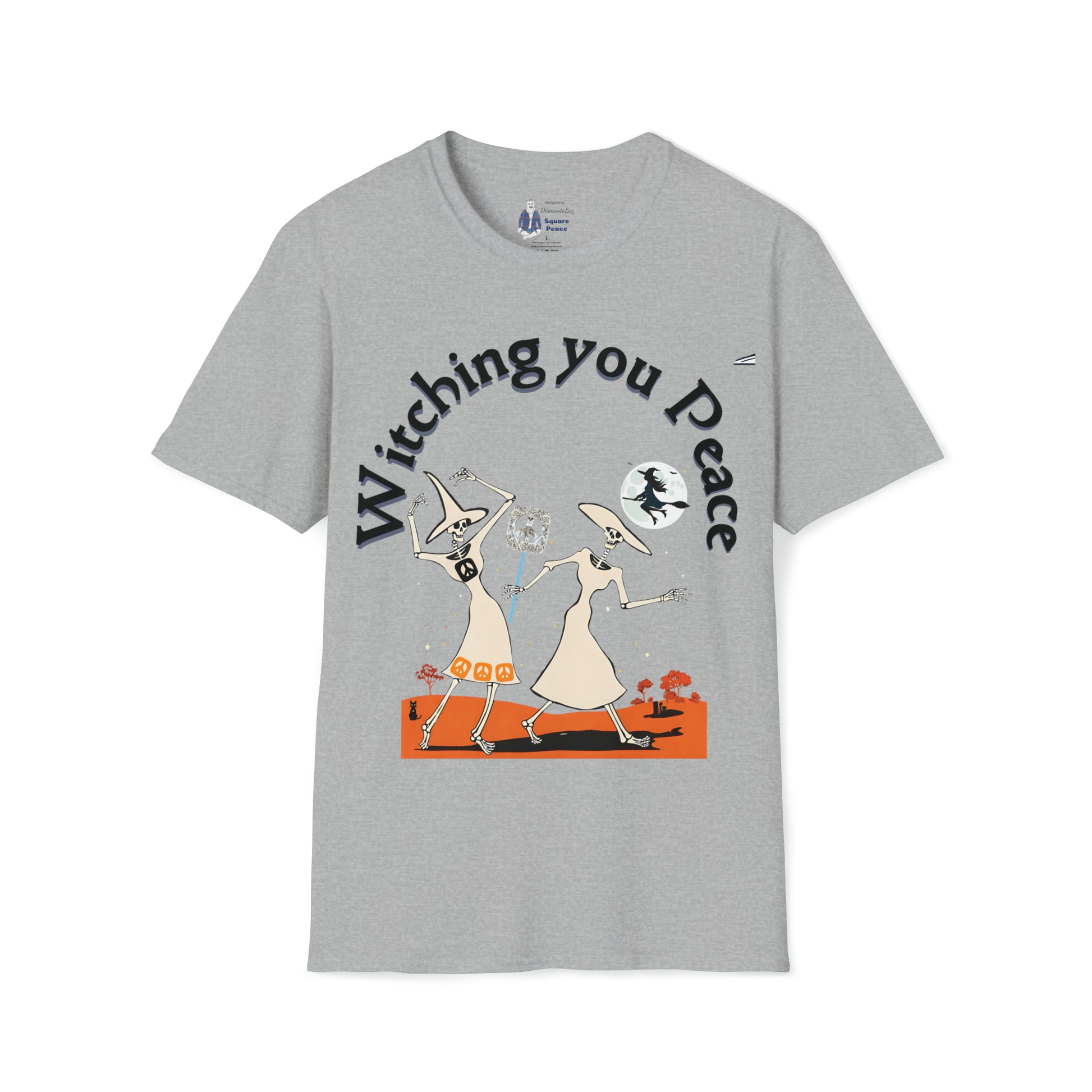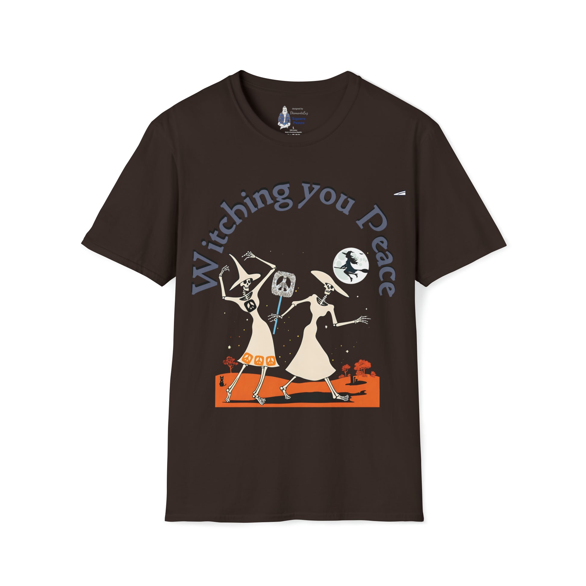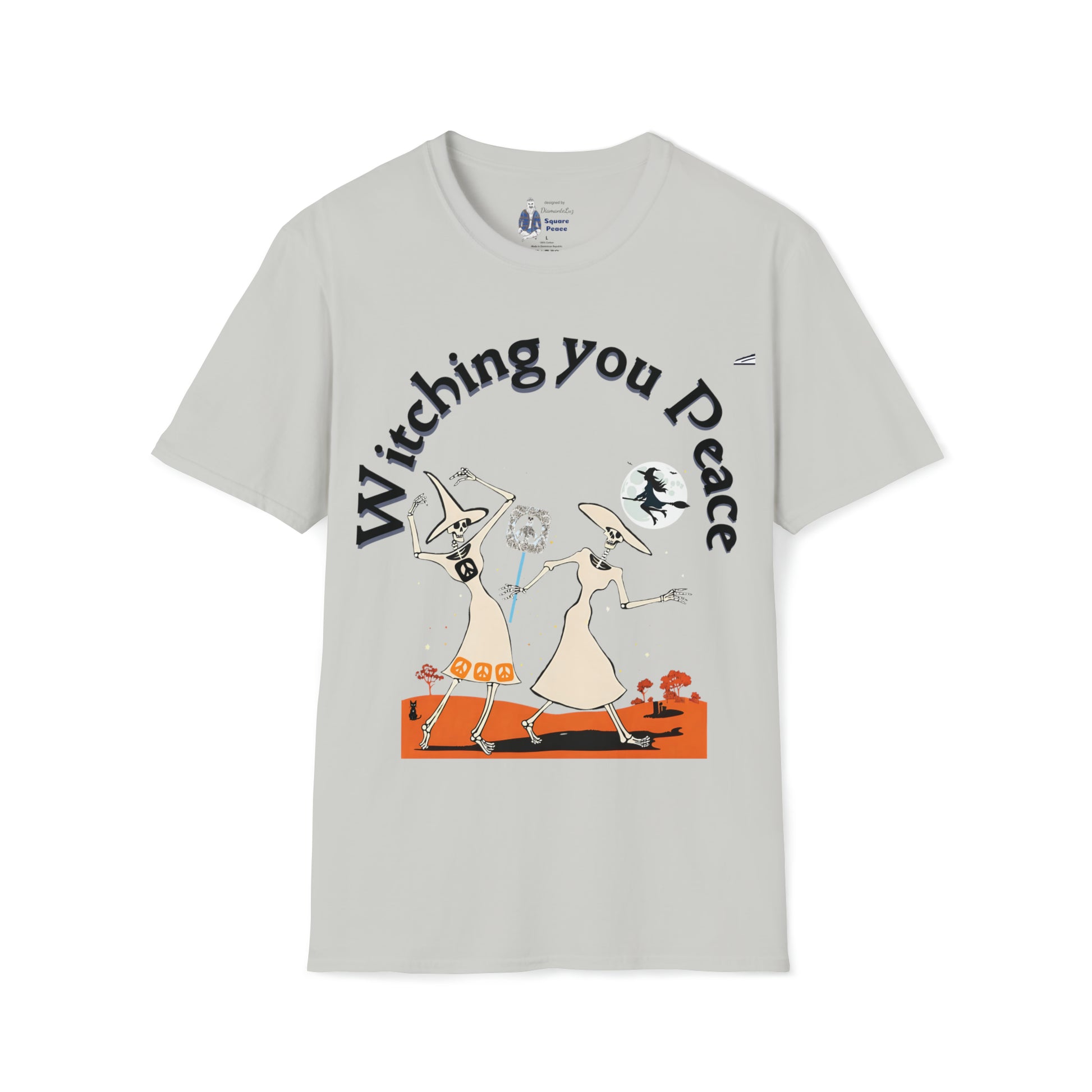 Have fun this Halloween and spread peace wearing your Witching You Peace T-Shirt for Halloween. This artist print shirt puts a new spin on casual comfort. Made from very soft materials, this tee is cotton and polyester. The shoulders have twill tape for improved durability. There are no side seams which provides extra comfort. The collar is made with ribbed knitting to prevent curling damage. This designer print is available on several different color shirts.